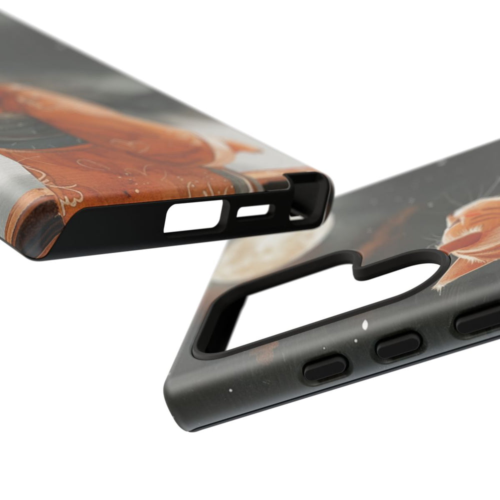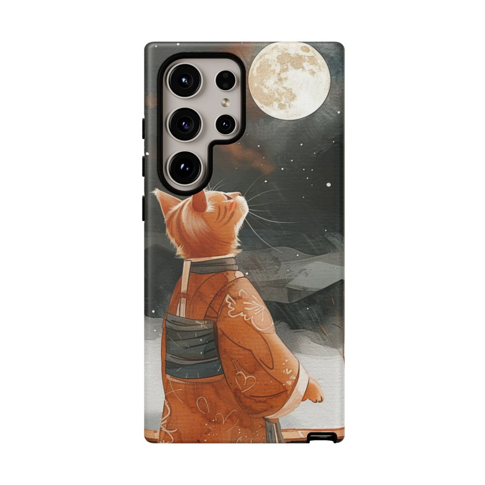 Dit hoesje toont een oranje kat in een traditioneel gewaad met bloemen- en hartjesmotieven. De kat kijkt omhoog naar een grote, heldere volle maan aan een donkere, met sterren bezaaide nachtelijke hemel. Op de achtergrond zijn verre bergen, kale bomen, een houten vloer en een raamkozijn te zien. Het hoesje is gemaakt van polycarbonaat en TPU, en is stevig ontworpen met ondersteuning voor draadloos opladen.