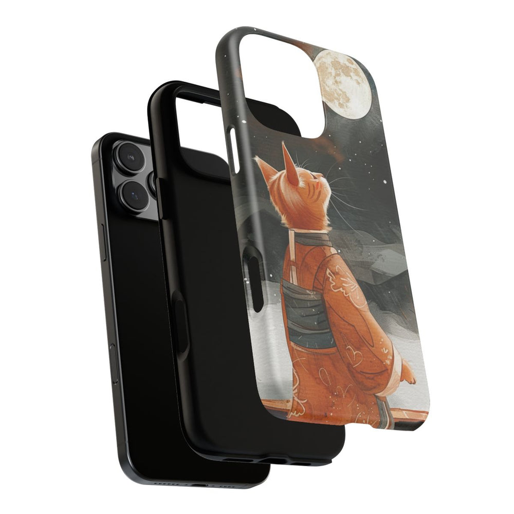 Dit hoesje toont een oranje kat in een traditioneel gewaad, staand binnenshuis bij een houten vensterraam. De kat kijkt omhoog naar een grote, heldere volle maan aan een donkere, met sterren bezaaide hemel. Op de achtergrond zijn vage bergsilhouetten en kale boomtakken zichtbaar. Het geheel is uitgevoerd in zachte, gedempte kleuren met veel oog voor detail en textuur. Het hoesje bestaat uit twee lagen: een stevige polycarbonaat buitenkant en een TPU binnenzijde. Geschikt voor draadloos opladen.