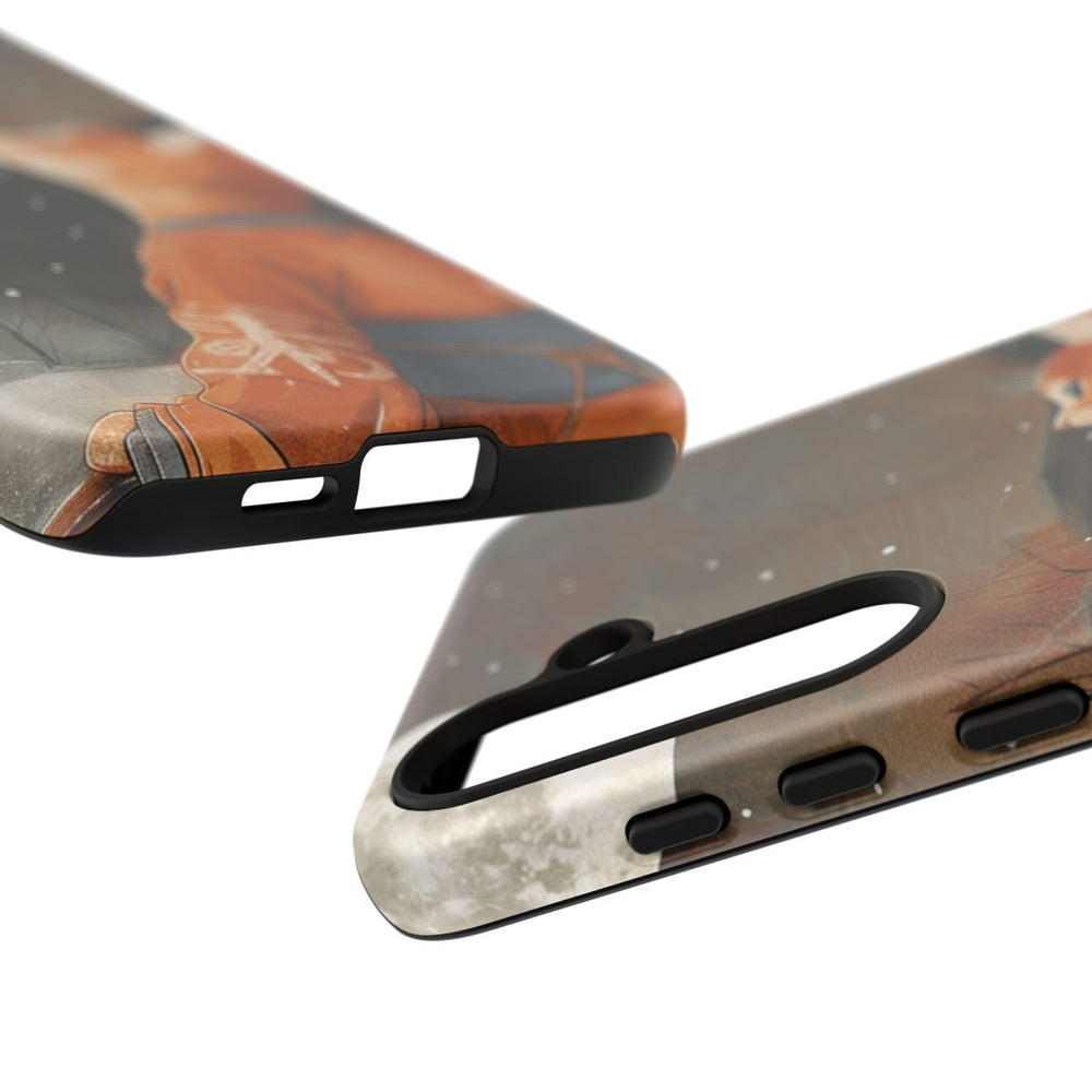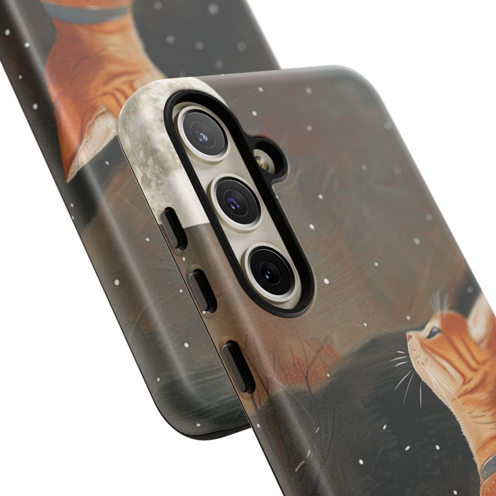 Dit hoesje toont een oranje kat in een traditioneel gewaad die omhoog kijkt naar een grote volle maan aan een sterrenhemel. Rechts is een raamkozijn te zien en op de achtergrond staan kale bomen, wat zorgt voor een rustige en sfeervolle nachtelijke uitstraling. Het stevige matte hoesje bestaat uit twee lagen van polycarbonaat en TPU, is geschikt voor draadloos opladen en biedt bescherming tegen invloeden van buitenaf.