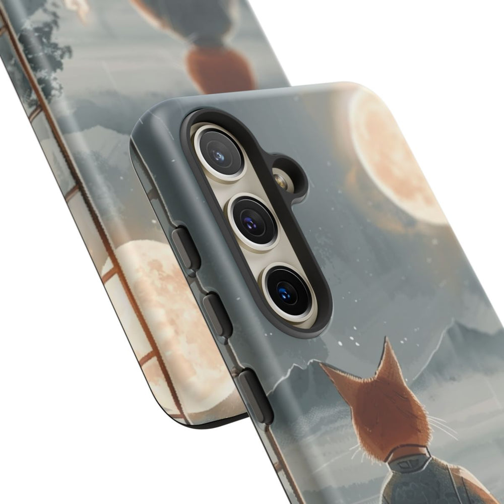 Dit telefoonhoesje toont een oranje kat in traditionele gewaden, zittend op een houten oppervlak bij een open raam. De kat kijkt uit naar een grote, stralende volle maan aan een nachtelijke hemel vol sterren. In de buurt staan een brandende kaars en een theepot, die een warme gloed aan het tafereel geven. Op de achtergrond zijn in de verte bergen en bomen te zien onder een heldere, sterrenhemel. Het hoesje bestaat uit twee lagen van polycarbonaat en TPU en is geschikt voor draadloos opladen.