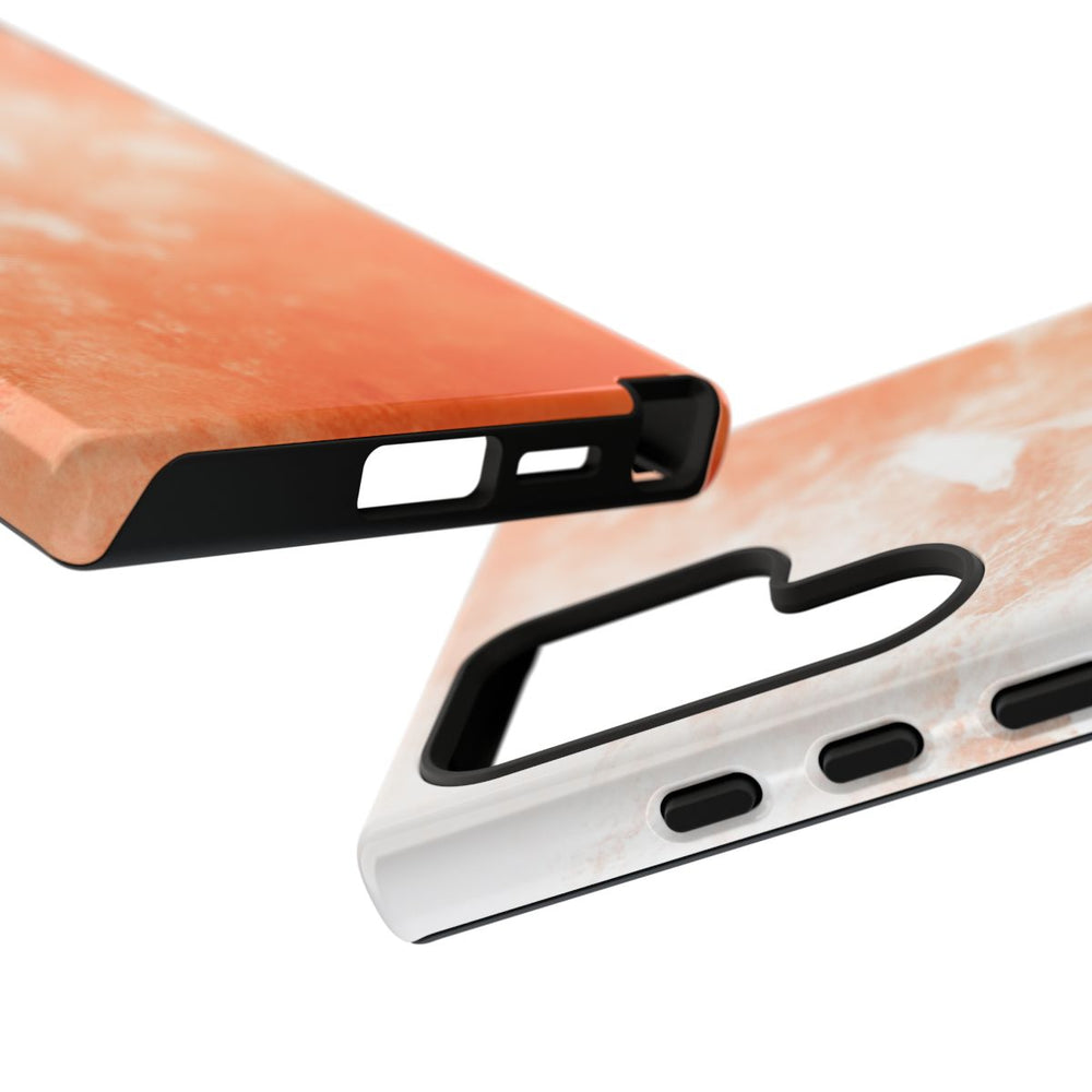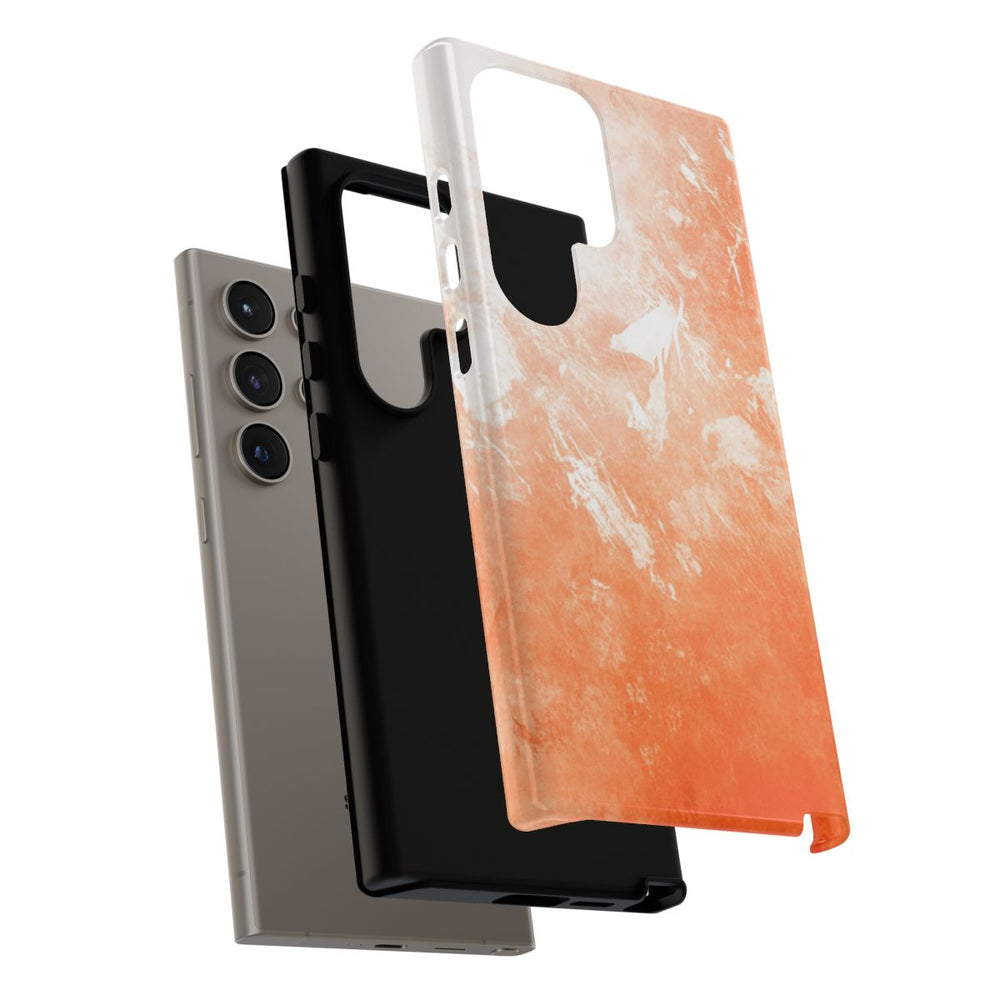 Dit ontwerp heeft een schilderachtige textuur in verschillende tinten oranje, die subtiel overlopen van lichte naar diepere kleuren. De textuur oogt zacht en abstract, met zichtbare penseelstreken en spatten voor een dynamisch en artistiek effect. Het patroon bedekt het volledige oppervlak en zorgt voor een levendige, warme uitstraling. Dit glanzende, stevige hoesje bestaat uit een dubbele laag: een polycarbonaat buitenkant en een TPU binnenzijde. Het biedt uitstekende bescherming en is geschikt voor draadloos opladen.