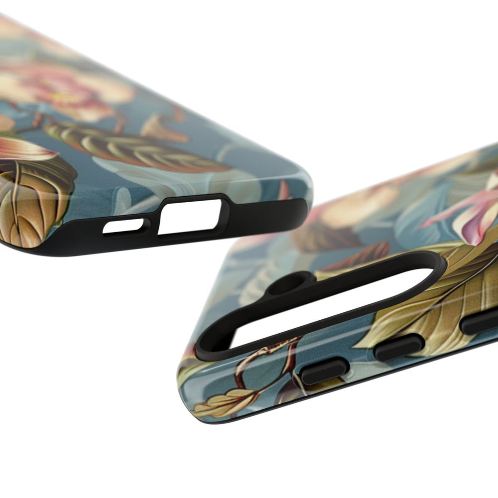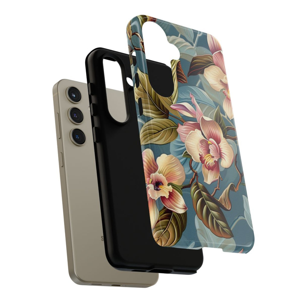 Dit hoesje heeft een verfijnd bloemenpatroon met orchideeën in zachte crème- en rozetinten. De bloemen worden omringd door groene en bruine bladeren met zichtbare nerven, geplaatst op een gedempte blauwe achtergrond met subtiele bladmotieven. Het ontwerp doet denken aan klassieke, Victoriaanse behangstijlen. Het glanzende hoesje is gemaakt van polycarbonaat en TPU en biedt dubbele bescherming. Dankzij de stevige materialen is het hoesje duurzaam en bestand tegen invloeden van buitenaf. Bovendien ondersteunt het draadloos opladen.
