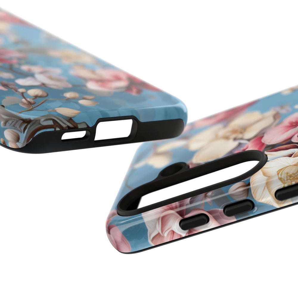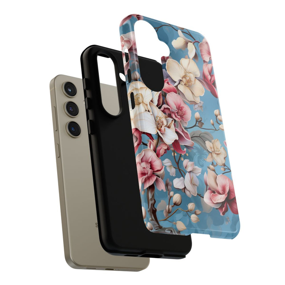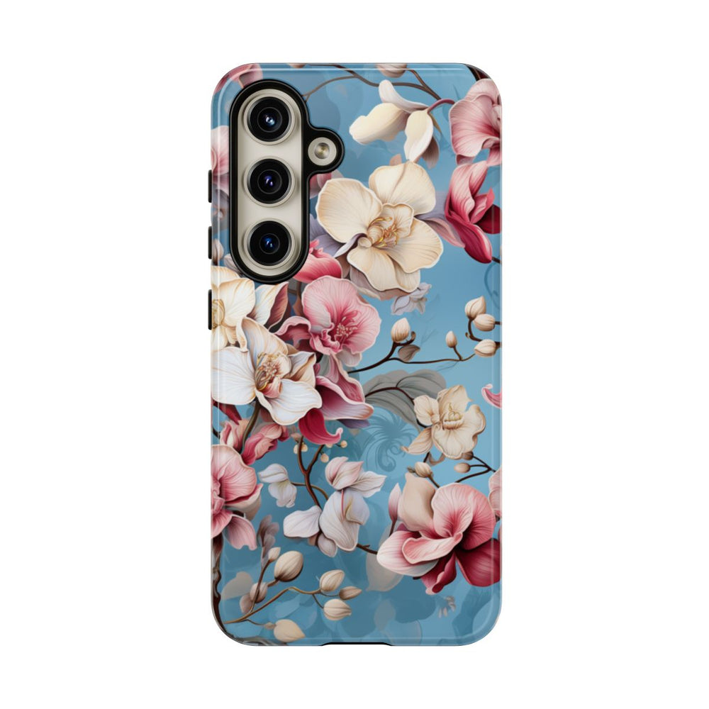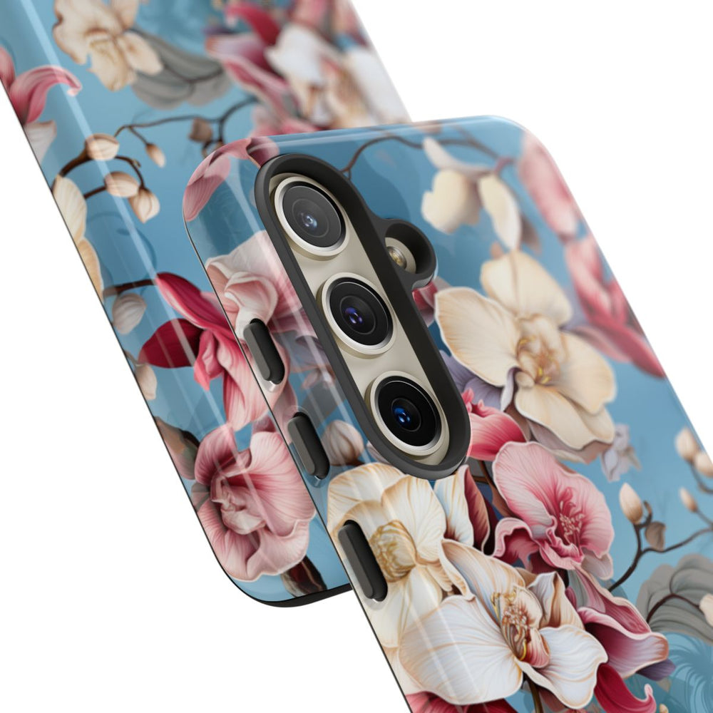 Dit hoesje is voorzien van een verfijnd patroon van orchideeën in zachte tinten roze, crème en wit. De bloemen zijn sierlijk gerangschikt aan dunne bruine takjes met knoppen, op een gladde blauwe achtergrond die zorgt voor diepte en contrast. De afbeelding is gedrukt op een glanzend, stevig hoesje van polycarbonaat en TPU en biedt dubbele bescherming. Dit hoesje ondersteunt draadloos opladen. Het elegante bloemenmotief is tijdloos en perfect voor liefhebbers van natuur geïnspireerde ontwerpen.