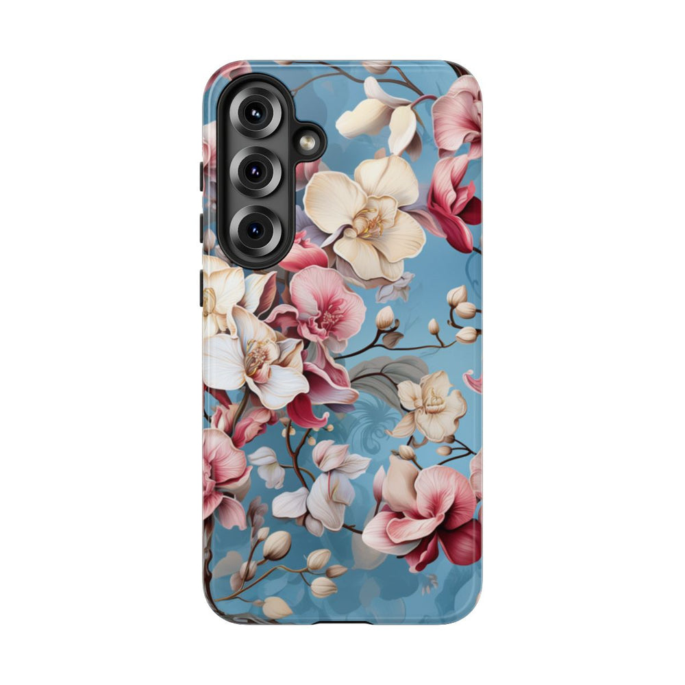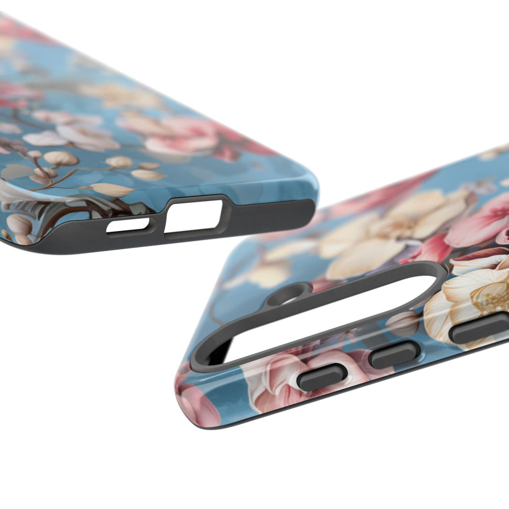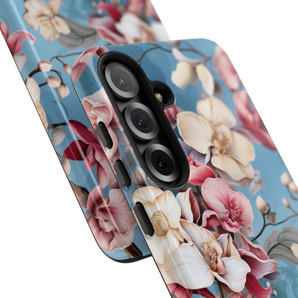 Dit hoesje is voorzien van een verfijnd patroon van orchideeën in zachte tinten roze, crème en wit. De bloemen zijn sierlijk gerangschikt aan dunne bruine takjes met knoppen, op een gladde blauwe achtergrond die zorgt voor diepte en contrast. De afbeelding is gedrukt op een glanzend, stevig hoesje van polycarbonaat en TPU en biedt dubbele bescherming. Dit hoesje ondersteunt draadloos opladen. Het elegante bloemenmotief is tijdloos en perfect voor liefhebbers van natuur geïnspireerde ontwerpen.