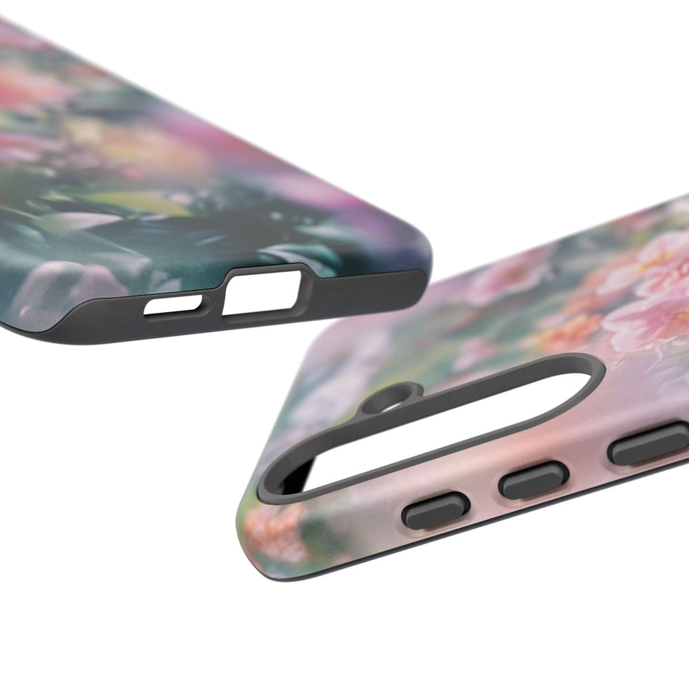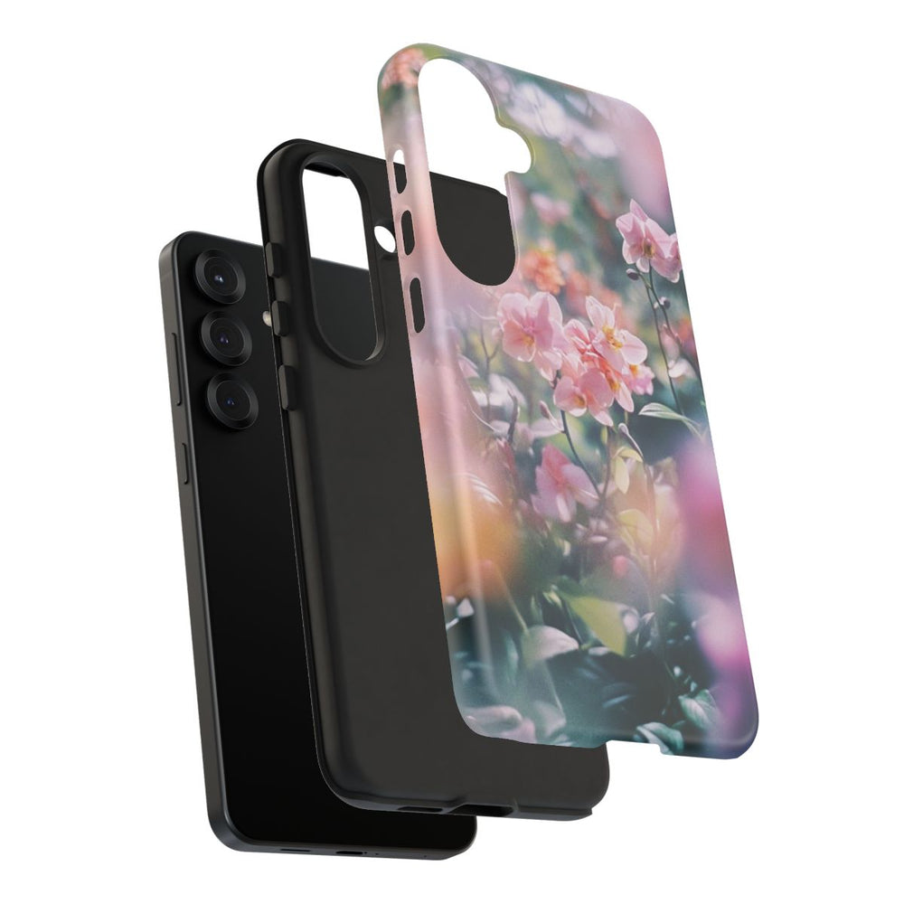 Dit ontwerp toont een prachtige compositie van orchideeën met zachte roze en paarse bloemen. De achtergrond is gevuld met vervaagde bloesems, wat zorgt voor een dromerige sfeer. Het beeld benadrukt de elegantie van de natuur en laat de fijne bloemblaadjes en weelderig groen mooi uitkomen. Dit telefoonhoesje heeft een stevige polycarbonaat buitenkant en een TPU-binnenzijde, waardoor je toestel optimaal wordt beschermd. Daarnaast ondersteunt het hoesje draadloos opladen, wat het extra praktisch maakt voor dagelijks gebruik.