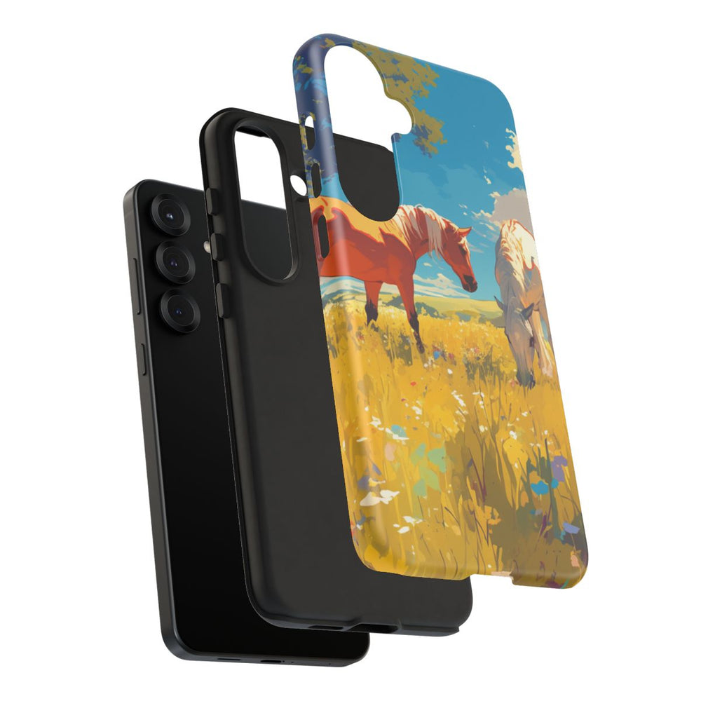Dit hoesje toont een levendig tafereel van paarden die grazen in een felgeel veld onder een heldere blauwe lucht met verspreide witte wolken. De paarden zijn afgebeeld in warme tinten bruin, wit en lichtbeige. Links op het ontwerp staat een grote boom met groene en gele bladeren, wat extra diepte geeft aan het landschap. De afbeelding straalt de rust uit van een zonnige dag in de natuur, met gedetailleerde bloemen en gras op de voorgrond. Het hoesje heeft een dubbele laag voor extra bescherming en is geschikt voor draadloos opladen.