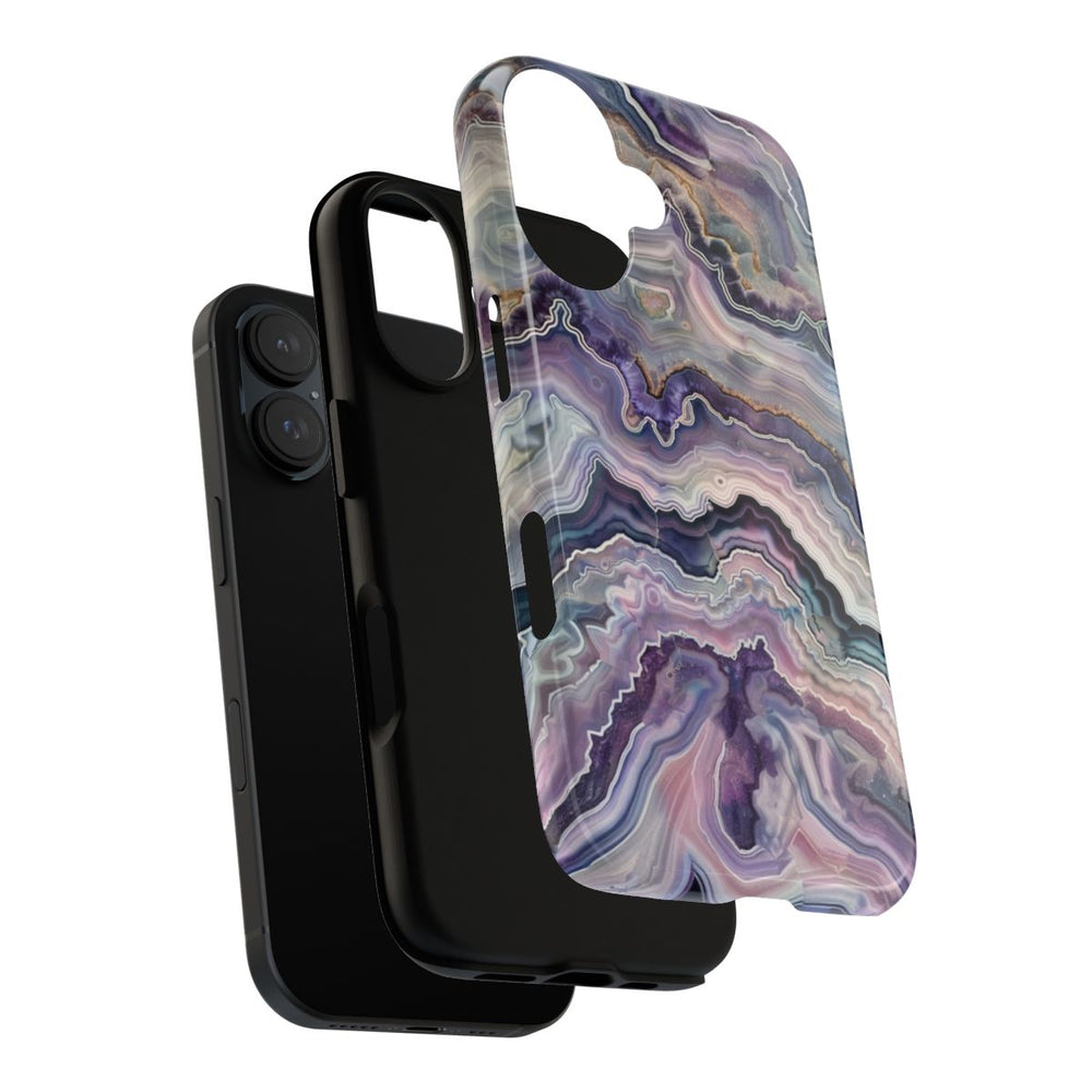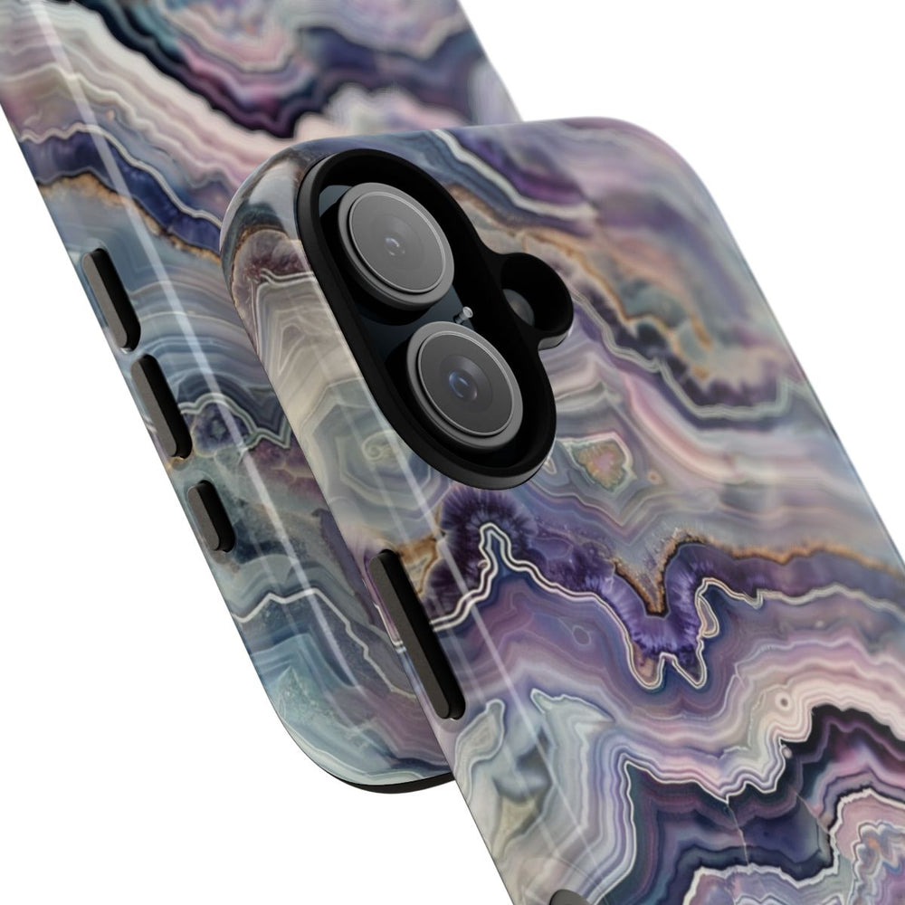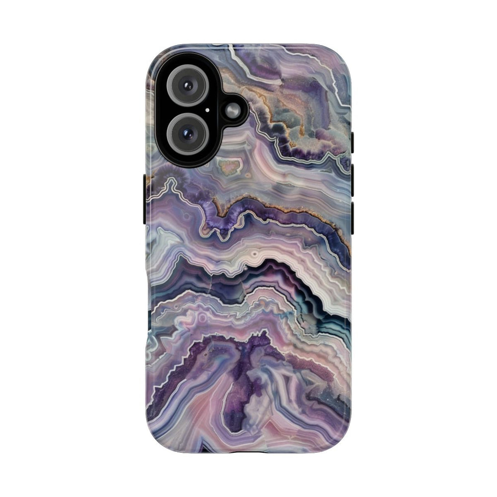 Dit telefoonhoesje heeft een gedetailleerd geodepatroon met golvende lagen in paarse, blauwe en witte tinten. De afbeelding toont natuurlijke agaatachtige vormen met fijne lijnen en banen, wat zorgt voor een gevoel van diepte en textuur. Het glanzende, stevige hoesje heeft een dubbele laag: een buitenkant van polycarbonaat en een binnenkant van TPU voor extra bescherming. Ondersteunt draadloos opladen en is bestand tegen weersinvloeden, terwijl het heldere uiterlijk behouden blijft.