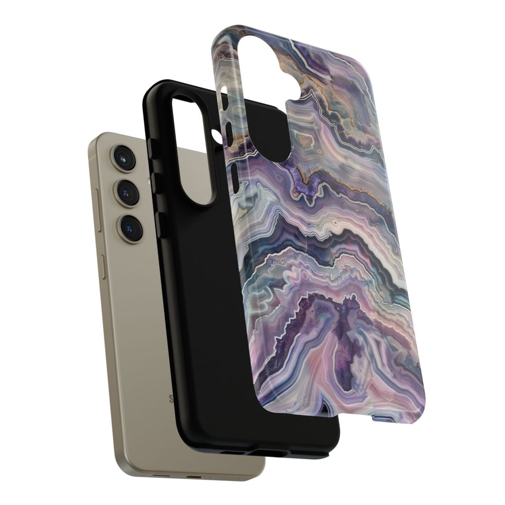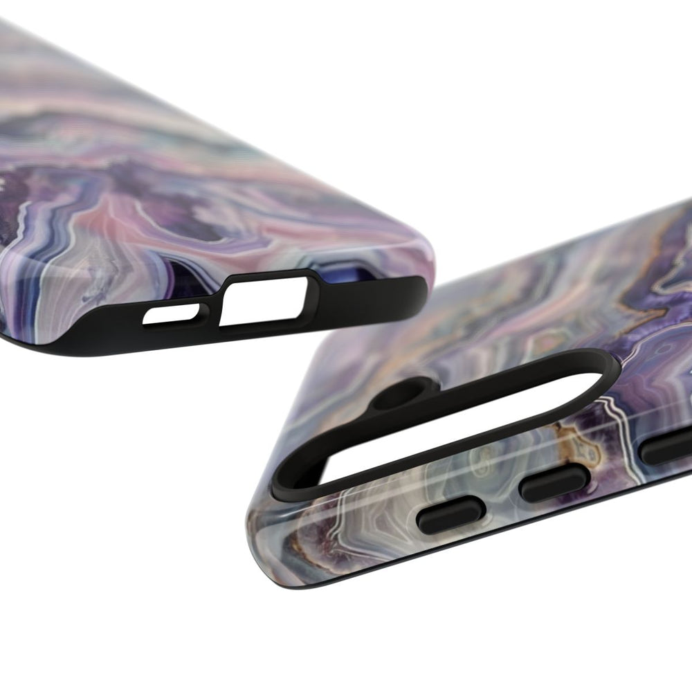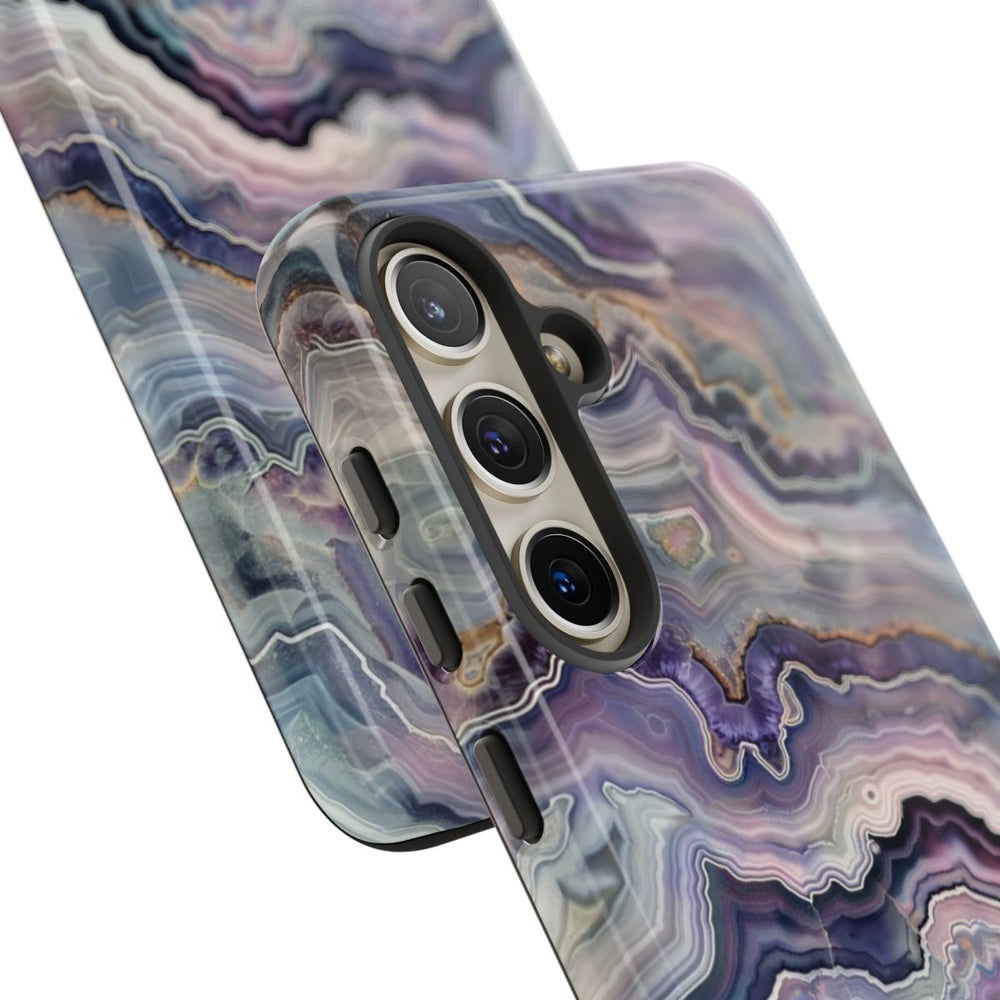 Dit telefoonhoesje heeft een gedetailleerd geodepatroon met golvende lagen in paarse, blauwe en witte tinten. De afbeelding toont natuurlijke agaatachtige vormen met fijne lijnen en banen, wat zorgt voor een gevoel van diepte en textuur. Het glanzende, stevige hoesje heeft een dubbele laag: een buitenkant van polycarbonaat en een binnenkant van TPU voor extra bescherming. Ondersteunt draadloos opladen en is bestand tegen weersinvloeden, terwijl het heldere uiterlijk behouden blijft.
