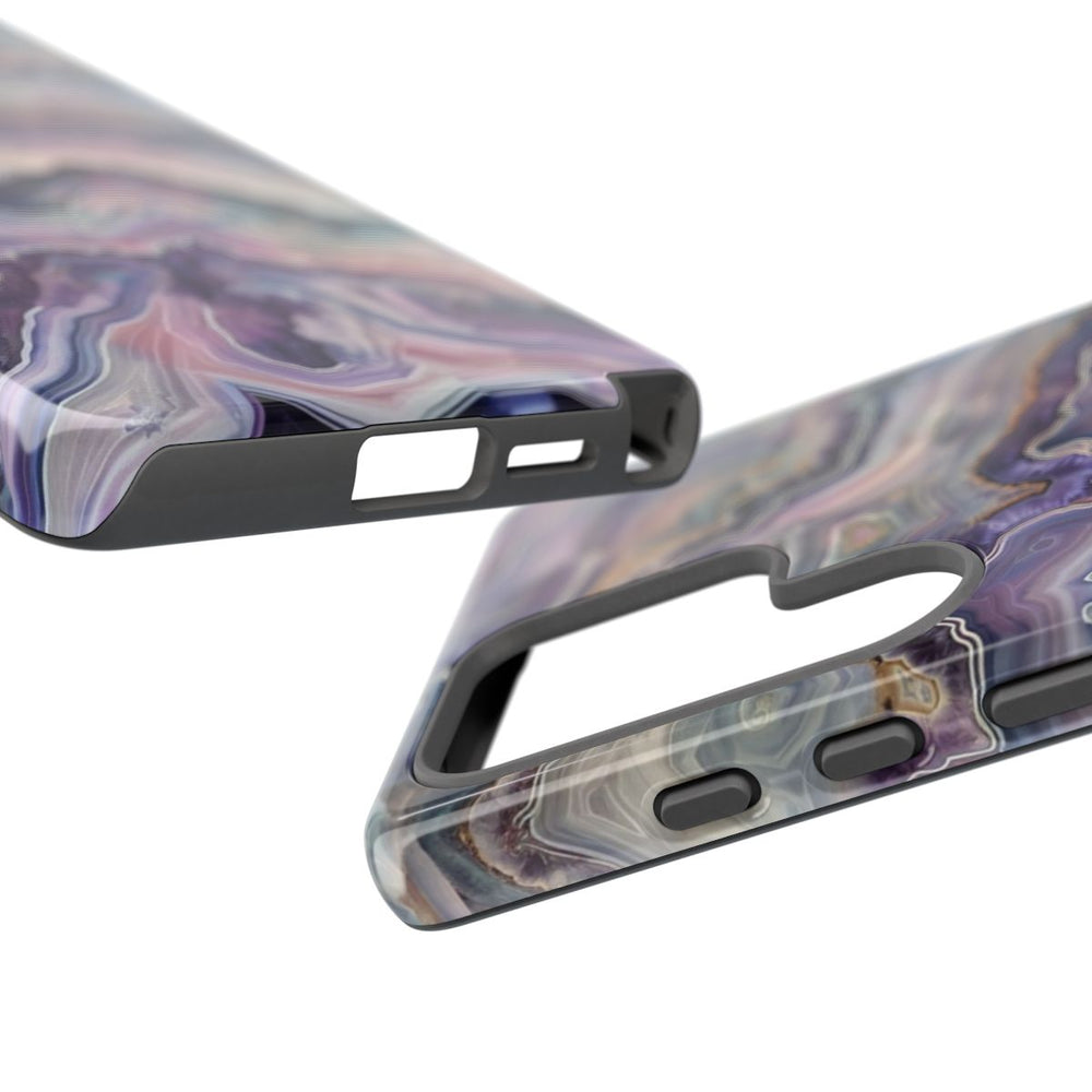 Dit telefoonhoesje heeft een gedetailleerd geodepatroon met golvende lagen in paarse, blauwe en witte tinten. De afbeelding toont natuurlijke agaatachtige vormen met fijne lijnen en banen, wat zorgt voor een gevoel van diepte en textuur. Het glanzende, stevige hoesje heeft een dubbele laag: een buitenkant van polycarbonaat en een binnenkant van TPU voor extra bescherming. Ondersteunt draadloos opladen en is bestand tegen weersinvloeden, terwijl het heldere uiterlijk behouden blijft.