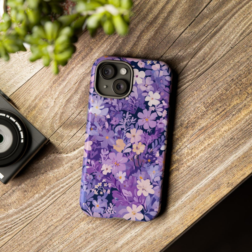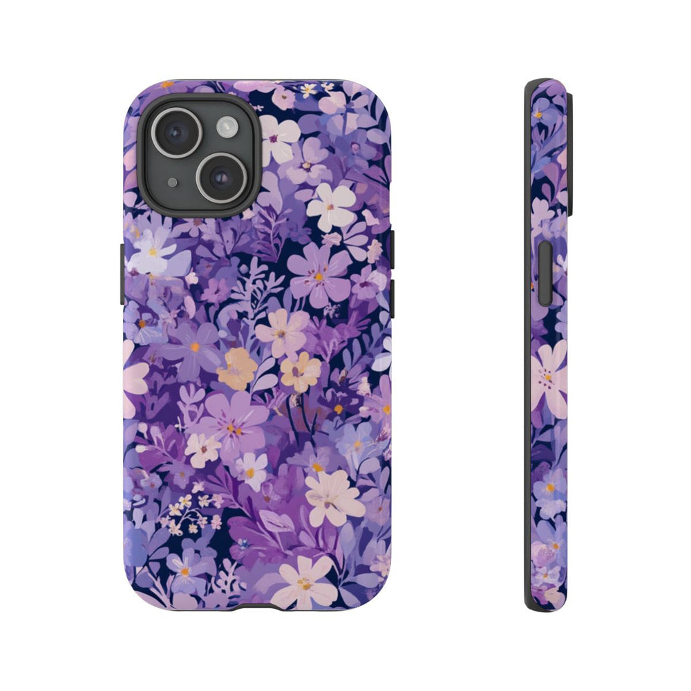 Dit hoesje is voorzien van een rijk patroon van bloemen en bladeren in tinten paars, lila en lichtroze. De bloemen en bladeren liggen dicht bij elkaar, wat zorgt voor een levendige en volle botanische uitstraling. De diepe paarse achtergrond laat de pasteltinten van de bloemen extra opvallen. Het patroon is gedrukt op een glanzend, stevig hoesje met een polycarbonaat buitenkant en een TPU binnenzijde. Dit zorgt voor dubbele bescherming en is geschikt voor draadloos opladen.