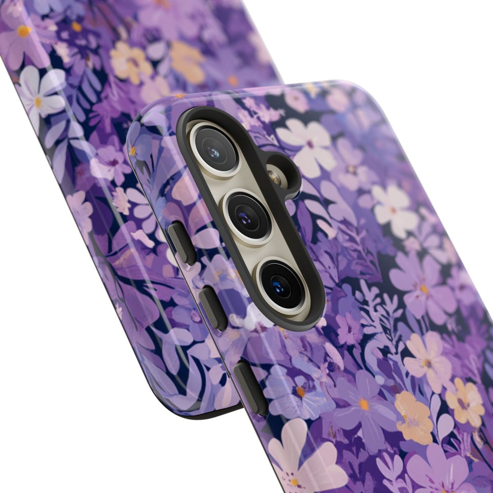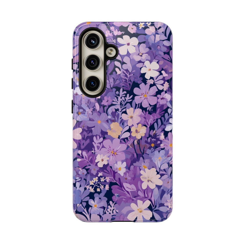 Dit hoesje is voorzien van een rijk patroon van bloemen en bladeren in tinten paars, lila en lichtroze. De bloemen en bladeren liggen dicht bij elkaar, wat zorgt voor een levendige en volle botanische uitstraling. De diepe paarse achtergrond laat de pasteltinten van de bloemen extra opvallen. Het patroon is gedrukt op een glanzend, stevig hoesje met een polycarbonaat buitenkant en een TPU binnenzijde. Dit zorgt voor dubbele bescherming en is geschikt voor draadloos opladen.