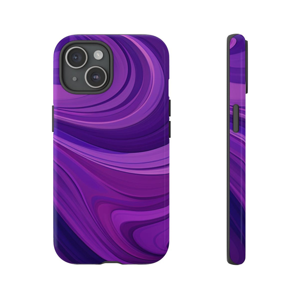 Dit telefoonhoesje heeft een abstract patroon van golvende vormen in verschillende paarstinten. De vloeiende, gebogen lijnen zorgen voor een gevoel van beweging en diepte, waarbij lichte en donkere paarse kleuren naadloos in elkaar overlopen. Het patroon bedekt het volledige oppervlak, wat het hoesje een levendige en dynamische uitstraling geeft. Het hoesje is glanzend afgewerkt en bestaat uit twee lagen: een stevige polycarbonaat buitenkant en een TPU-binnenzijde voor extra bescherming en duurzaamheid. Het hoesje ondersteunt draadloos opladen en is bestand tegen weersinvloeden.