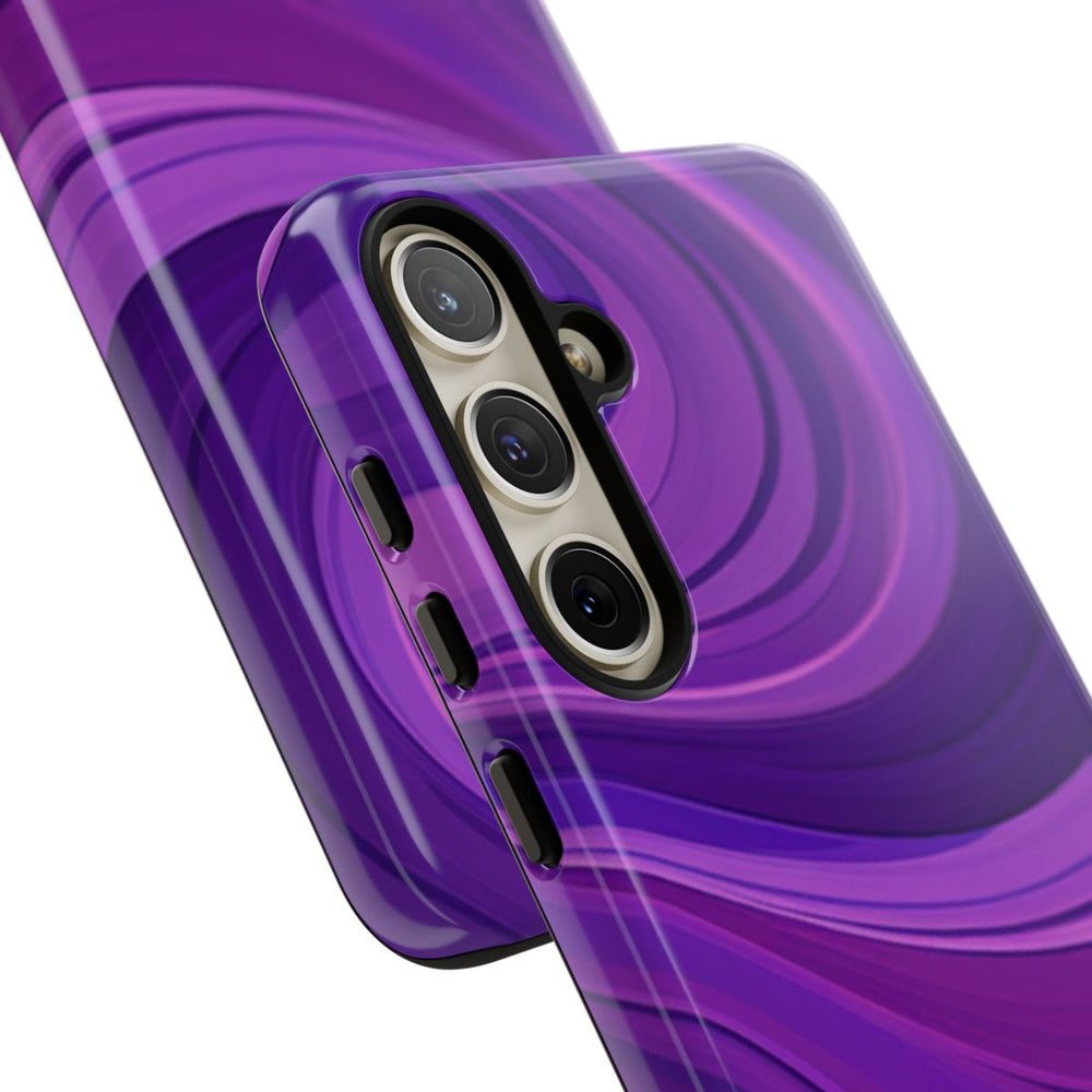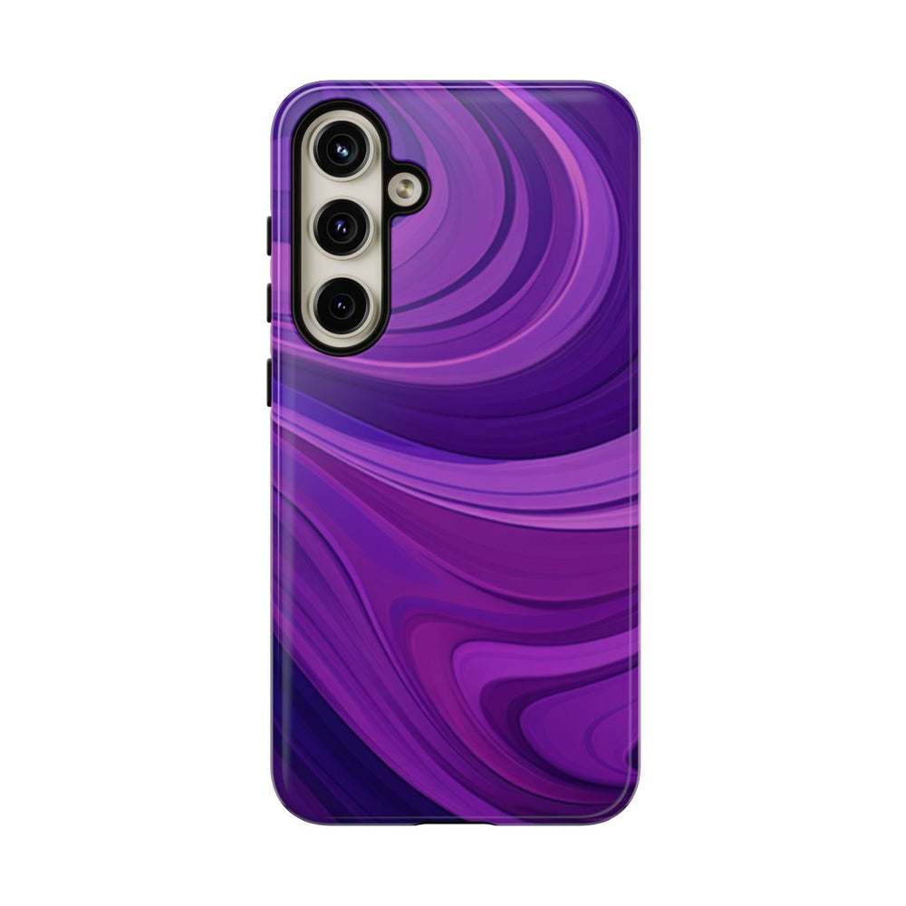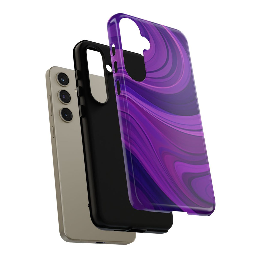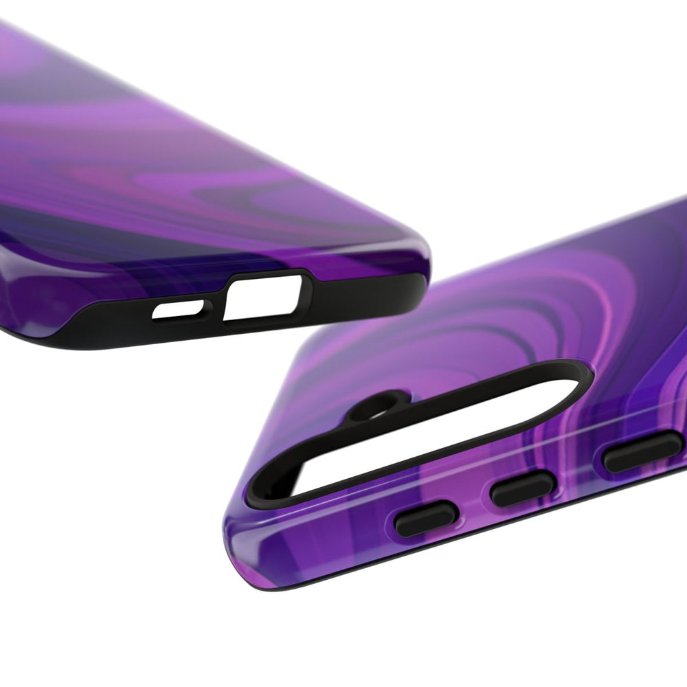 Dit telefoonhoesje heeft een abstract patroon van golvende vormen in verschillende paarstinten. De vloeiende, gebogen lijnen zorgen voor een gevoel van beweging en diepte, waarbij lichte en donkere paarse kleuren naadloos in elkaar overlopen. Het patroon bedekt het volledige oppervlak, wat het hoesje een levendige en dynamische uitstraling geeft. Het hoesje is glanzend afgewerkt en bestaat uit twee lagen: een stevige polycarbonaat buitenkant en een TPU-binnenzijde voor extra bescherming en duurzaamheid. Het hoesje ondersteunt draadloos opladen en is bestand tegen weersinvloeden.