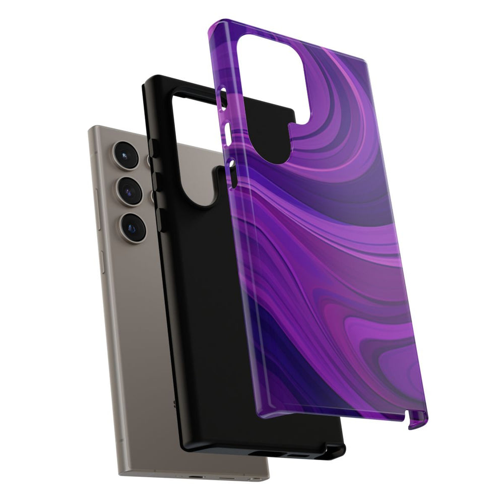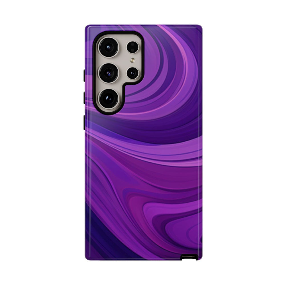 Dit telefoonhoesje heeft een abstract patroon van golvende vormen in verschillende paarstinten. De vloeiende, gebogen lijnen zorgen voor een gevoel van beweging en diepte, waarbij lichte en donkere paarse kleuren naadloos in elkaar overlopen. Het patroon bedekt het volledige oppervlak, wat het hoesje een levendige en dynamische uitstraling geeft. Het hoesje is glanzend afgewerkt en bestaat uit twee lagen: een stevige polycarbonaat buitenkant en een TPU-binnenzijde voor extra bescherming en duurzaamheid. Het hoesje ondersteunt draadloos opladen en is bestand tegen weersinvloeden.