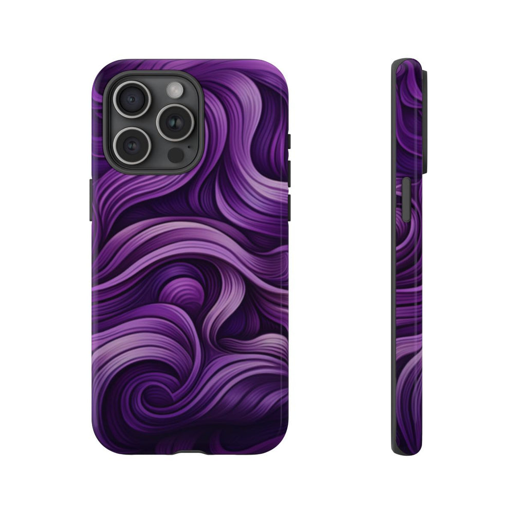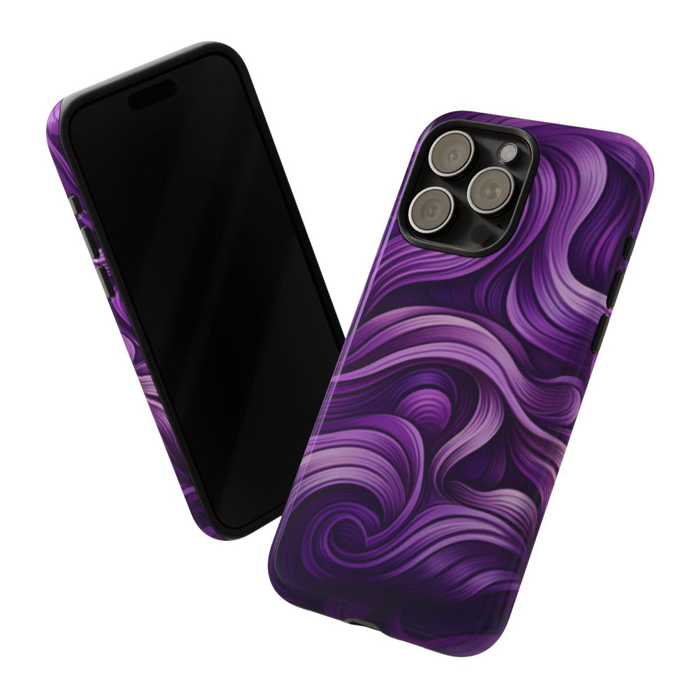 Dit hoesje heeft een verfijnd patroon van golvende lijnen in verschillende paarstinten. De vloeiende lijnen zorgen voor een gevoel van diepte en beweging, vergelijkbaar met stromende golven of strengen. Het ontwerp is rijk gedetailleerd met een prachtig kleurverloop van licht lavendel tot diep violet. De afbeelding is gedrukt op een glanzend, stevig hoesje met een polycarbonaat buitenkant en een TPU-binnenzijde. Dit zorgt voor dubbele bescherming en maakt draadloos opladen mogelijk. Het hoesje is ontworpen voor duurzaamheid en biedt goede bescherming tegen invloeden van buitenaf.