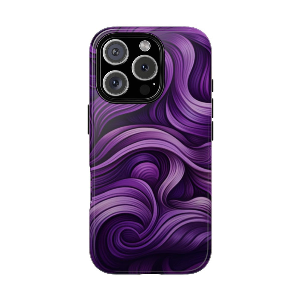 Dit hoesje heeft een verfijnd patroon van golvende lijnen in verschillende paarstinten. De vloeiende lijnen zorgen voor een gevoel van diepte en beweging, vergelijkbaar met stromende golven of strengen. Het ontwerp is rijk gedetailleerd met een prachtig kleurverloop van licht lavendel tot diep violet. De afbeelding is gedrukt op een glanzend, stevig hoesje met een polycarbonaat buitenkant en een TPU-binnenzijde. Dit zorgt voor dubbele bescherming en maakt draadloos opladen mogelijk. Het hoesje is ontworpen voor duurzaamheid en biedt goede bescherming tegen invloeden van buitenaf.