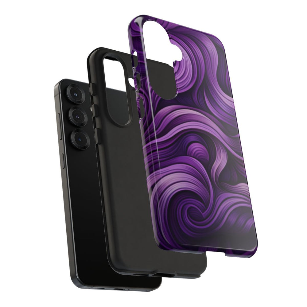 Dit hoesje heeft een verfijnd patroon van golvende lijnen in verschillende paarstinten. De vloeiende lijnen zorgen voor een gevoel van diepte en beweging, vergelijkbaar met stromende golven of strengen. Het ontwerp is rijk gedetailleerd met een prachtig kleurverloop van licht lavendel tot diep violet. De afbeelding is gedrukt op een glanzend, stevig hoesje met een polycarbonaat buitenkant en een TPU-binnenzijde. Dit zorgt voor dubbele bescherming en maakt draadloos opladen mogelijk. Het hoesje is ontworpen voor duurzaamheid en biedt goede bescherming tegen invloeden van buitenaf.