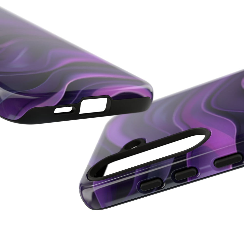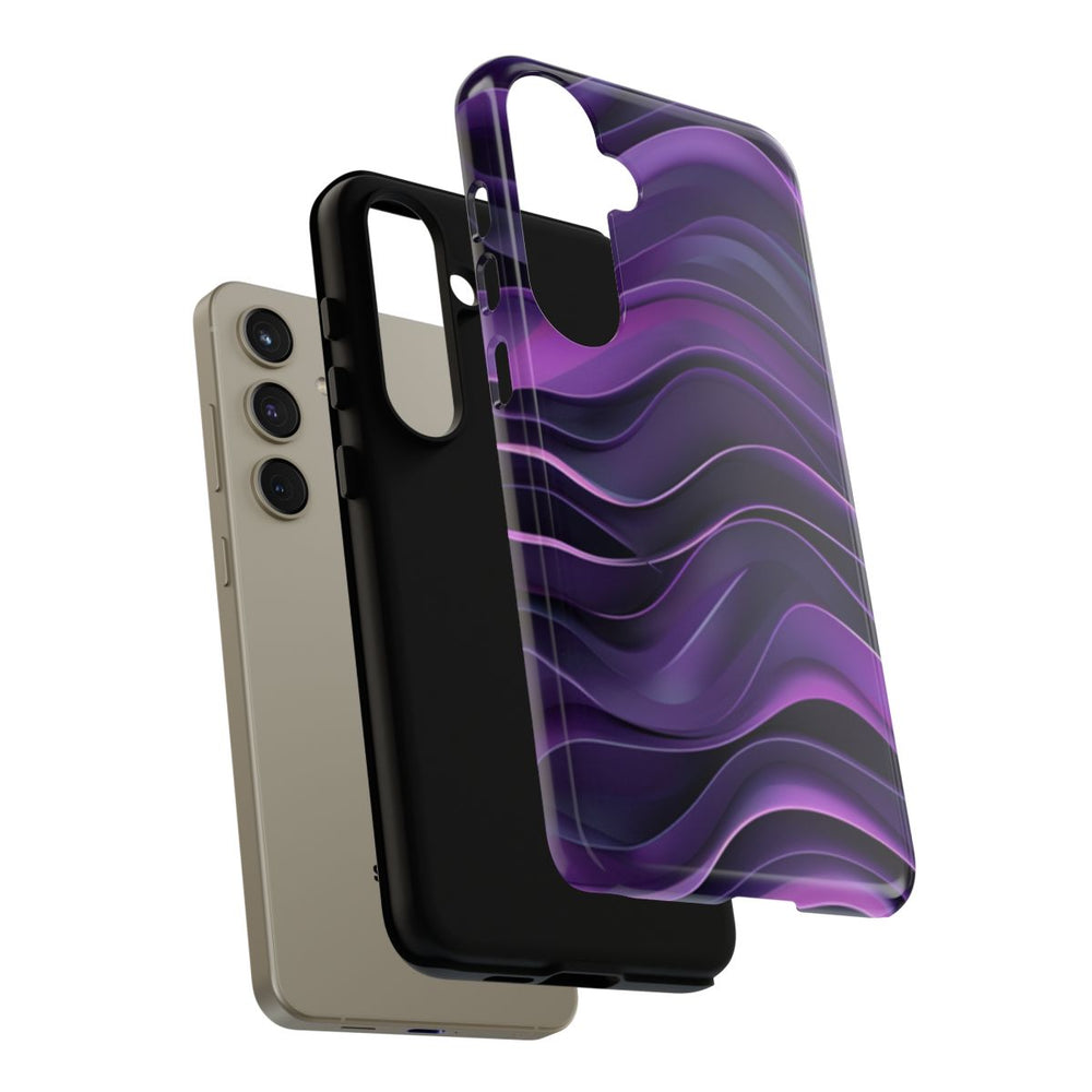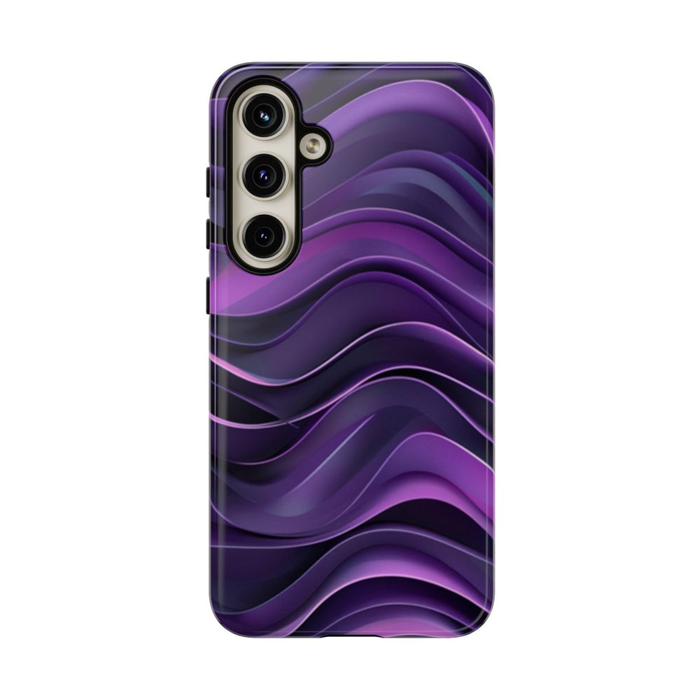 Dit telefoonhoesje is voorzien van een abstract patroon met vloeiende, golvende vormen in verschillende tinten paars. De golven zorgen voor een gevoel van diepte en beweging dankzij de soepele, gelaagde lijnen. Het kleurenpalet varieert van licht lila tot diep violet, wat het ontwerp een rijke en dynamische uitstraling geeft. Het hoesje heeft een glanzende afwerking en bestaat uit een stevige polycarbonaat buitenkant met een TPU-binnenlaag voor optimale bescherming. Dankzij de dubbele laag is je telefoon extra goed beschermd en kun je draadloos opladen. Het patroon bedekt de volledige oppervlakte van het hoesje, waardoor het een opvallende en stijlvolle uitstraling krijgt.