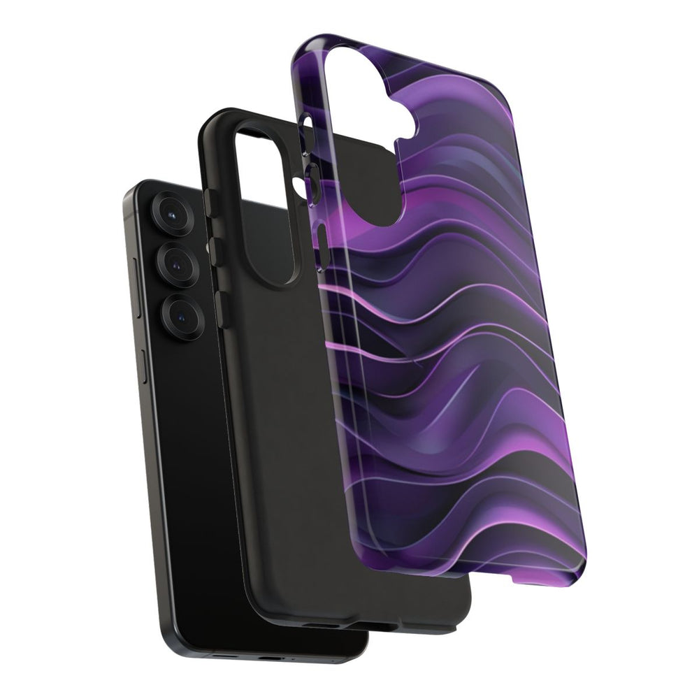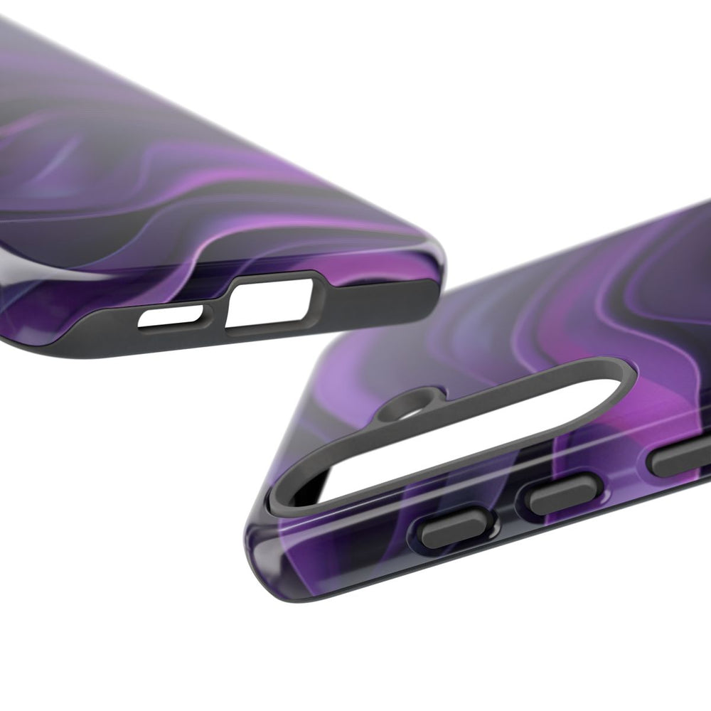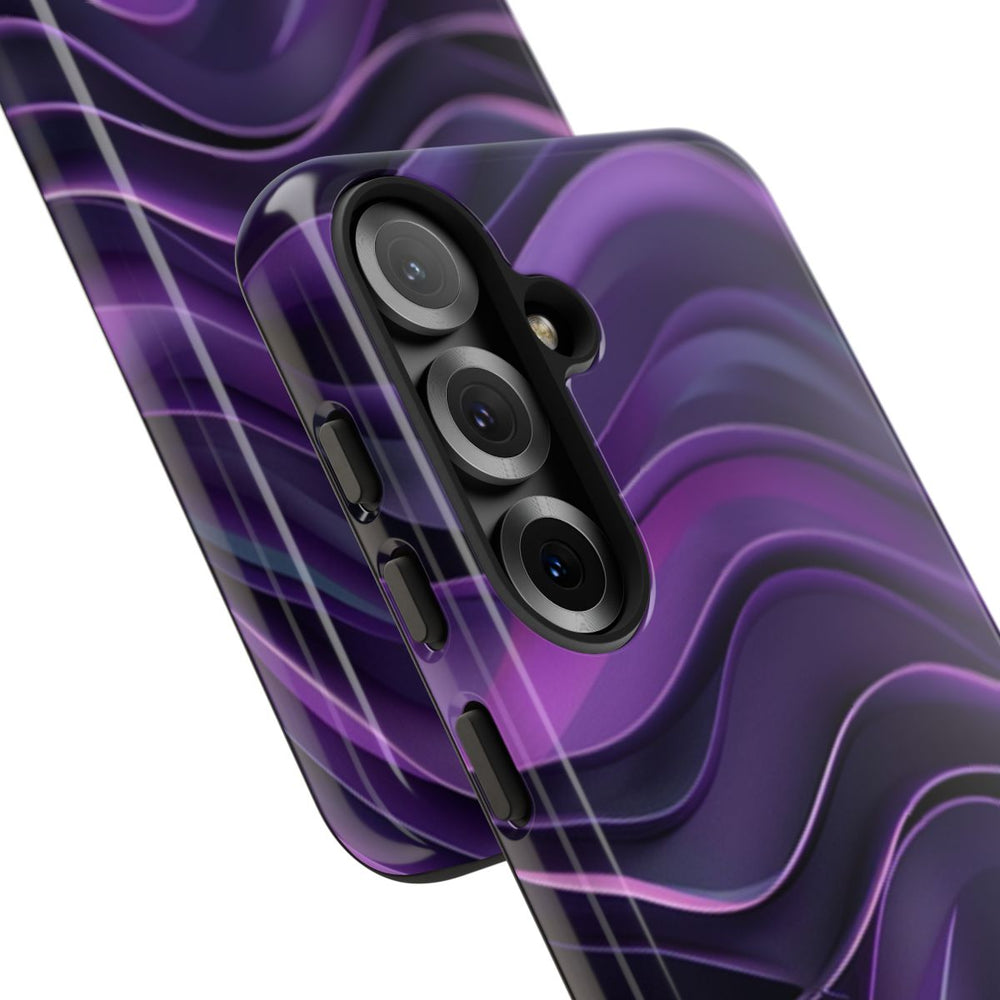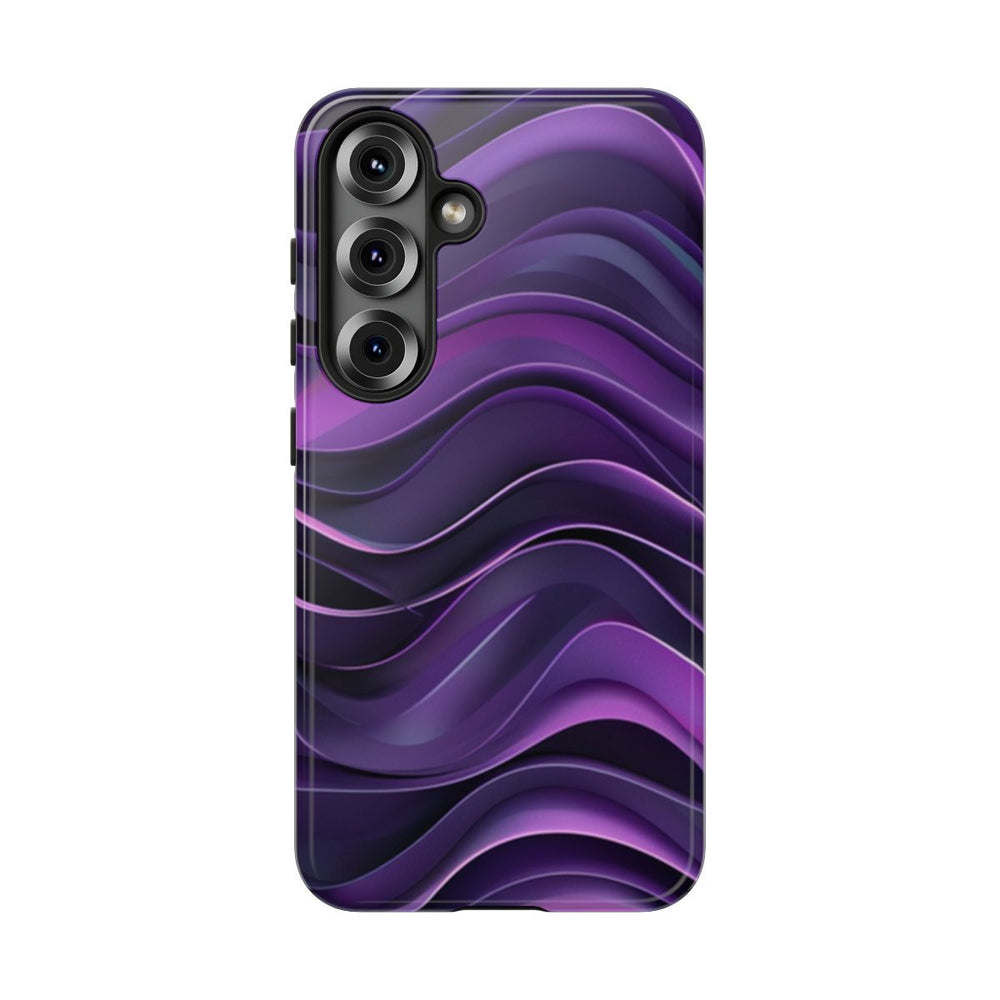 Dit telefoonhoesje is voorzien van een abstract patroon met vloeiende, golvende vormen in verschillende tinten paars. De golven zorgen voor een gevoel van diepte en beweging dankzij de soepele, gelaagde lijnen. Het kleurenpalet varieert van licht lila tot diep violet, wat het ontwerp een rijke en dynamische uitstraling geeft. Het hoesje heeft een glanzende afwerking en bestaat uit een stevige polycarbonaat buitenkant met een TPU-binnenlaag voor optimale bescherming. Dankzij de dubbele laag is je telefoon extra goed beschermd en kun je draadloos opladen. Het patroon bedekt de volledige oppervlakte van het hoesje, waardoor het een opvallende en stijlvolle uitstraling krijgt.
