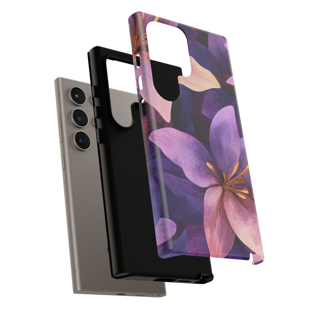 Dit hoesje heeft een opvallend bloemenpatroon met bloemen in verschillende tinten paars en lichtroze. De bloemblaadjes hebben een voelbare structuur en zijn afgewerkt met gouden details op de meeldraden, wat zorgt voor een elegante uitstraling. De achtergrond bestaat uit diepere paarstinten, waardoor de lichtere bloemblaadjes extra opvallen. De afbeelding is gedrukt op een mat hoesje van polycarbonaat en TPU, dat bestaat uit twee lagen voor optimale bescherming en geschikt is voor draadloos opladen. Het geheel oogt levendig en artistiek, perfect voor liefhebbers van bloemenmotieven.