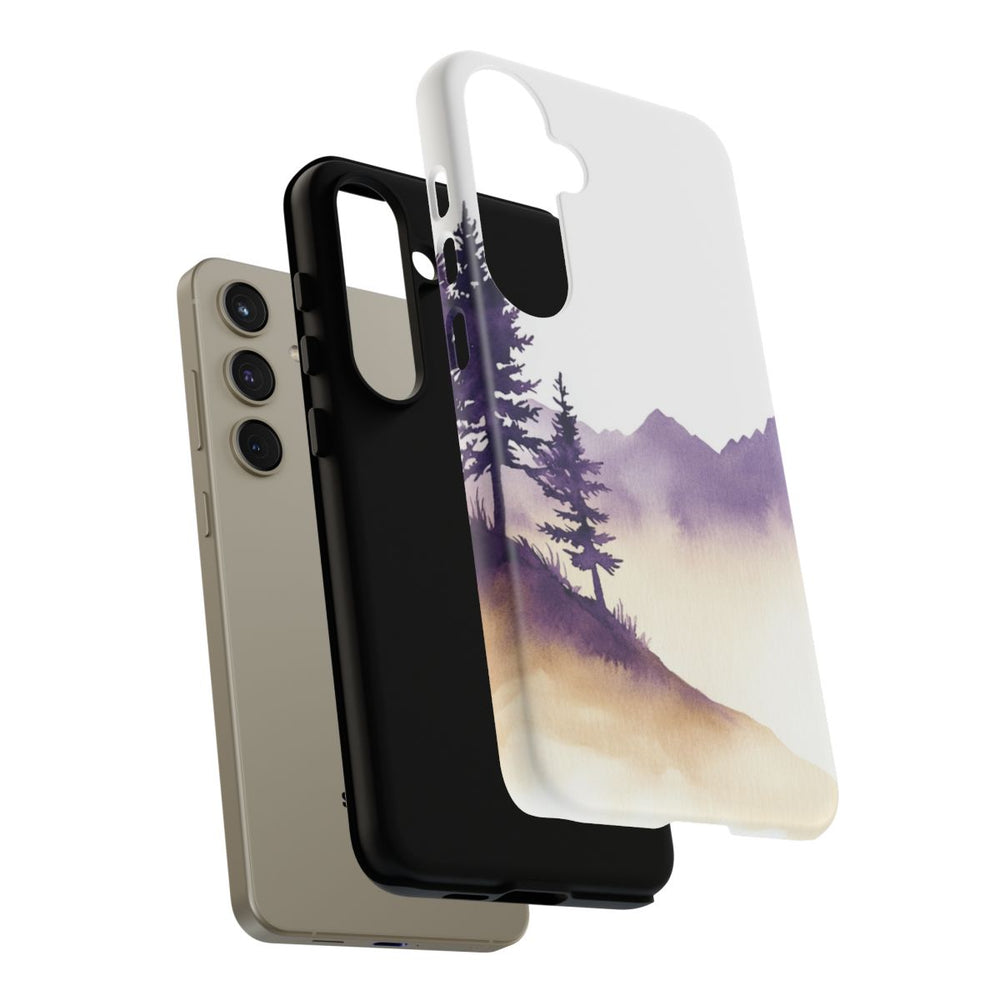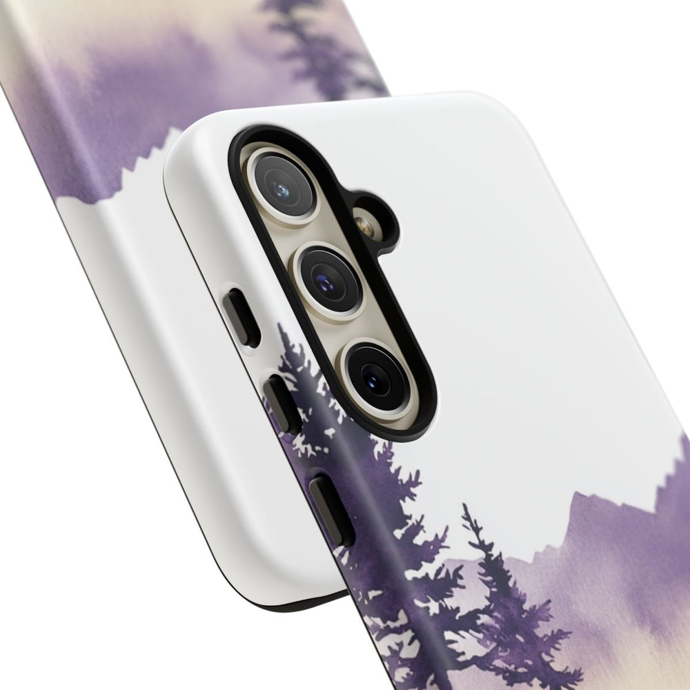 Dit hoesje heeft een minimalistisch aquarelontwerp met enkele paarse bomen langs een heuvel. Achter de heuvel zijn mistige bergen te zien in zachte paarse tinten die vervagen in een beige nevel. De witte achtergrond zorgt voor een rustige en serene uitstraling. Het hoesje bestaat uit twee stevige lagen van polycarbonaat en TPU, is duurzaam en ondersteunt draadloos opladen.