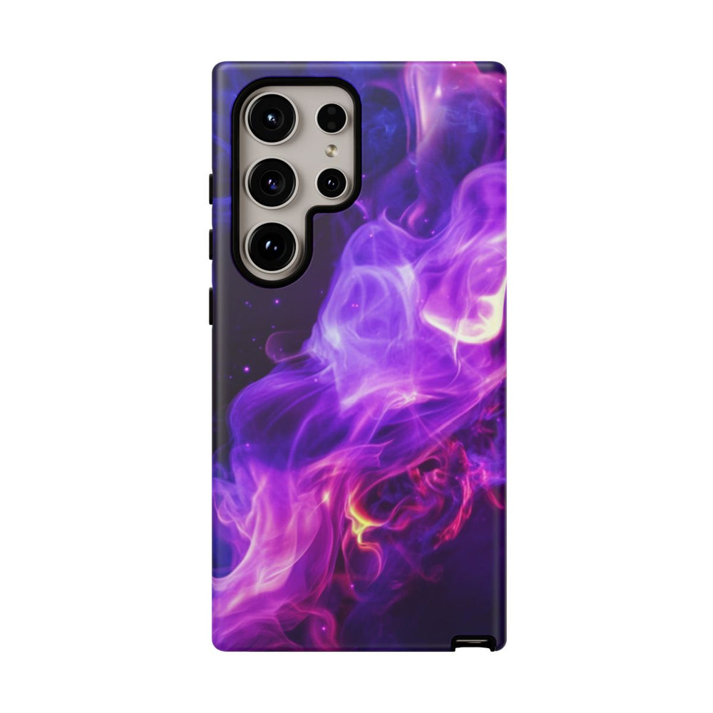 Dit hoesje heeft een opvallend ontwerp met draaiende rook in levendige paarse en blauwe tinten, wat zorgt voor een dynamisch en mysterieus effect. De rook vloeit naadloos over in de donkere achtergrond, waardoor diepte en contrast ontstaan. Het matte hoesje bestaat uit een stevige polycarbonaat buitenkant en een TPU-binnenlaag voor optimale bescherming. Geschikt voor draadloos opladen en bestand tegen verschillende weersomstandigheden, met langdurige helderheid van het ontwerp.