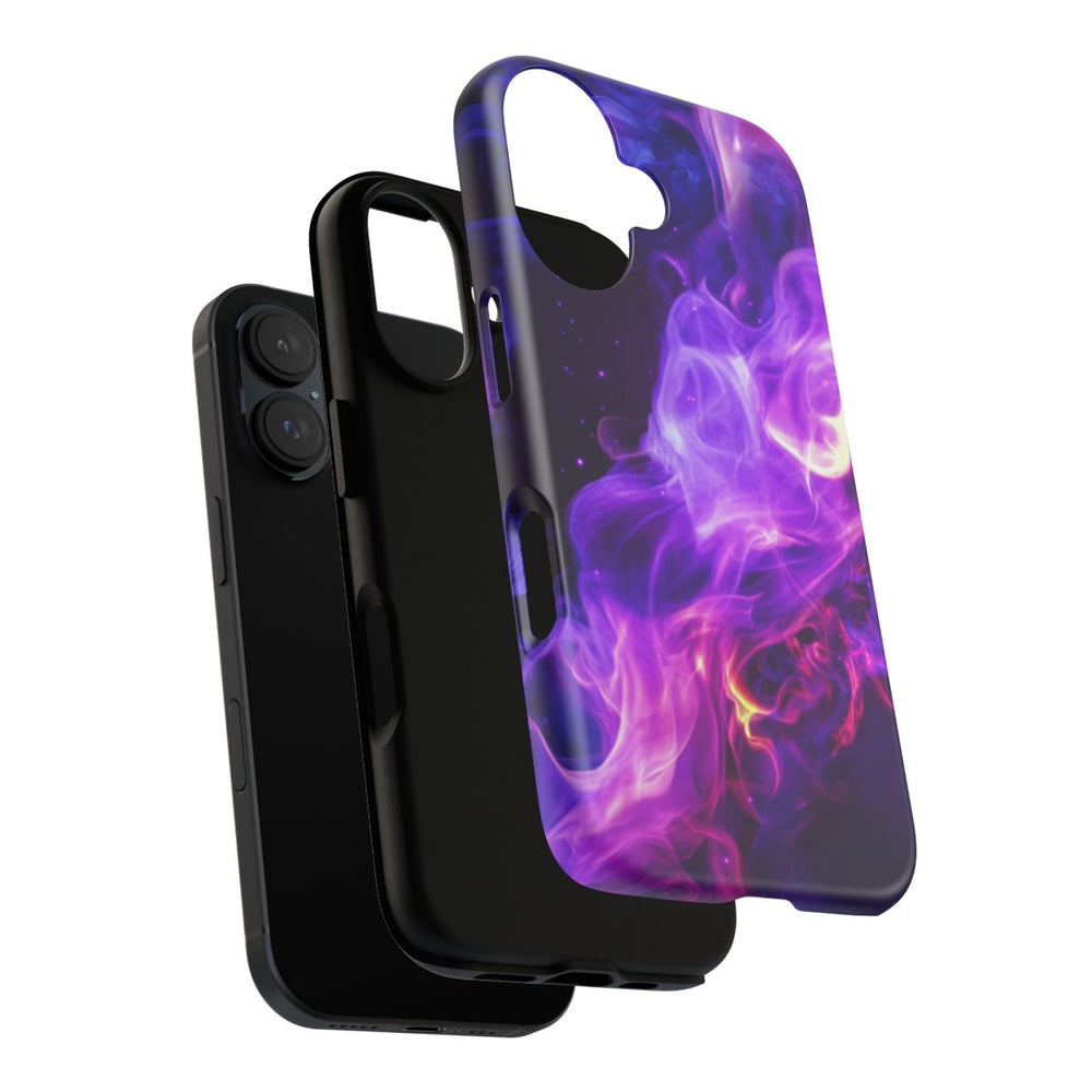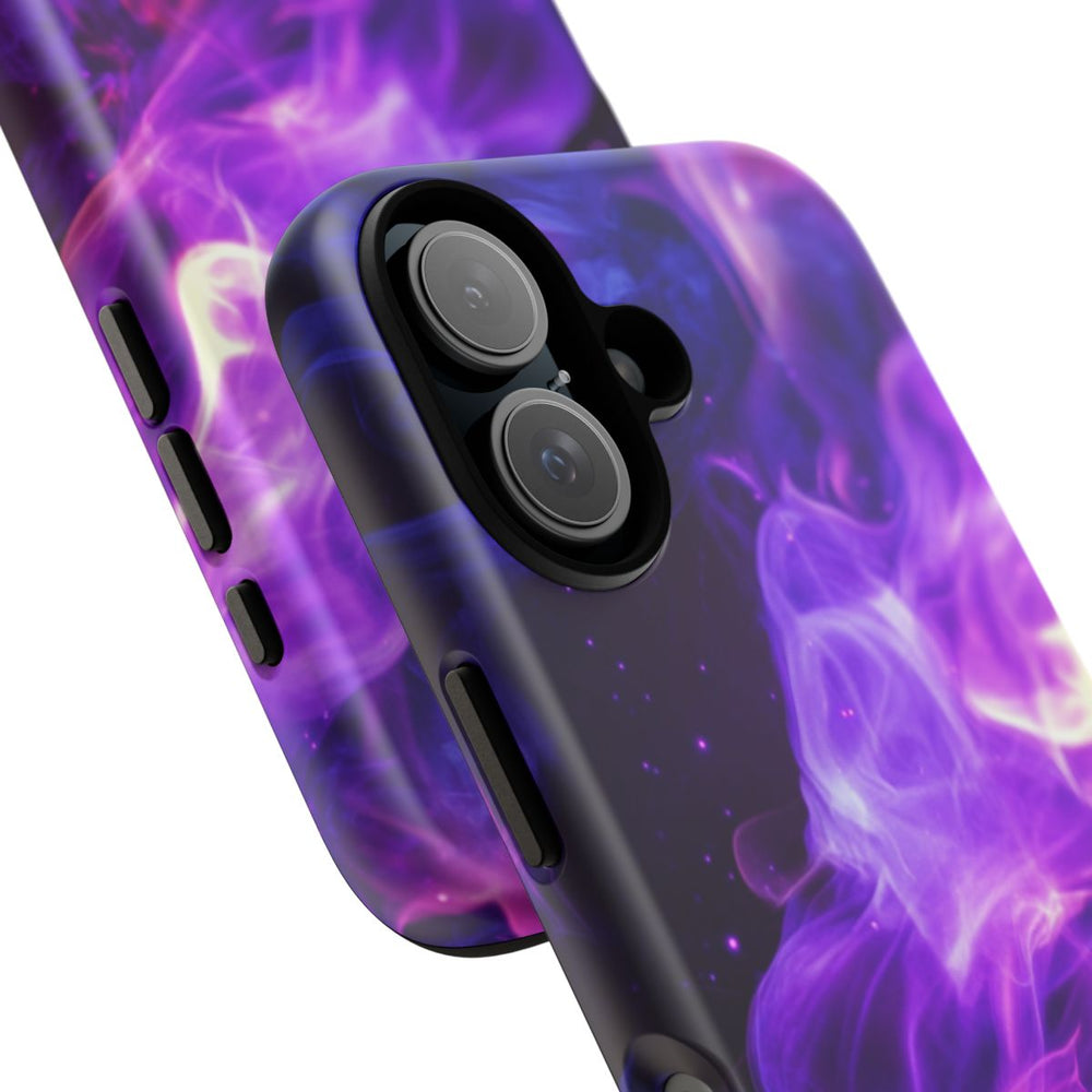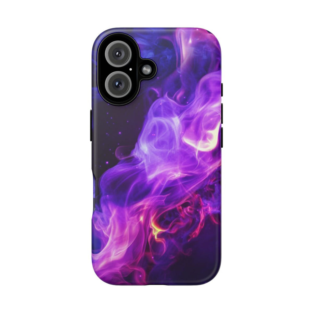 Dit hoesje heeft een opvallend abstract ontwerp met draaiende paarse en blauwe vlammen, subtiel aangevuld met roze en gele accenten. De vlammen kronkelen over een donkere achtergrond en zorgen voor een dynamisch en levendig effect. De afbeelding is gedrukt op een mat hoesje van polycarbonaat en TPU met een dubbele beschermlaag. Dit hoesje ondersteunt draadloos opladen en is ontworpen voor langdurige bescherming en blijvende beeldkwaliteit, ook bij gebruik buitenshuis.