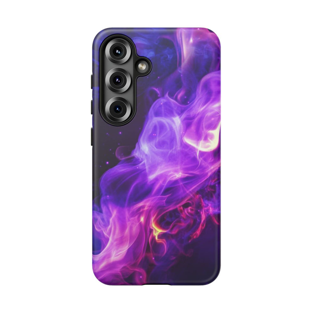 Dit telefoonhoesje heeft een opvallend ontwerp met draaiende vlammen in levendige tinten paars en blauw, aangevuld met roze en gele accenten. Het abstracte vuurpatroon zorgt voor een dynamisch en energiek effect tegen een donkere achtergrond. Het hoesje bestaat uit twee lagen met een matte afwerking: een stevige buitenkant van polycarbonaat en een binnenzijde van TPU voor extra bescherming en duurzaamheid. Draadloos opladen wordt ondersteund. Niet geschikt voor magnetische opladers.