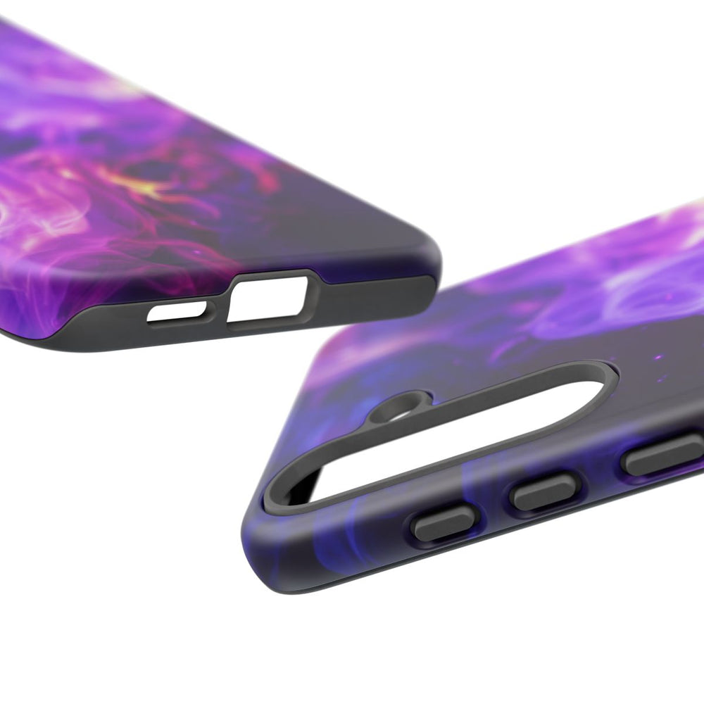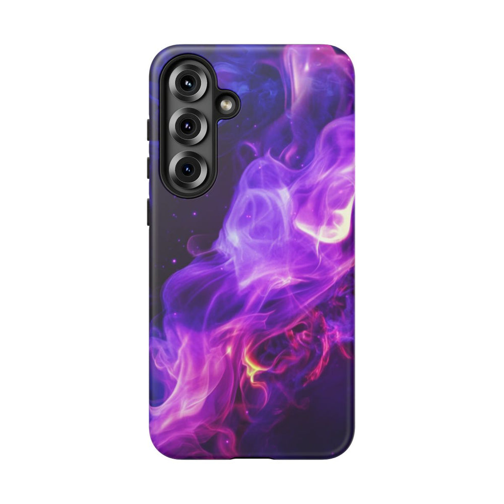 Dit telefoonhoesje heeft een opvallend ontwerp met draaiende vlammen in levendige paarse en blauwe tinten, aangevuld met accenten van geel en roze. De donkere achtergrond laat de gloeiende en rokerige uitstraling van de vlammen extra goed uitkomen. Het matte hoesje is stevig uitgevoerd met een polycarbonaat buitenkant en een TPU-binnenzijde, voor optimale bescherming dankzij de dubbele laag. Ondersteunt draadloos opladen. Niet geschikt voor MagSafe.