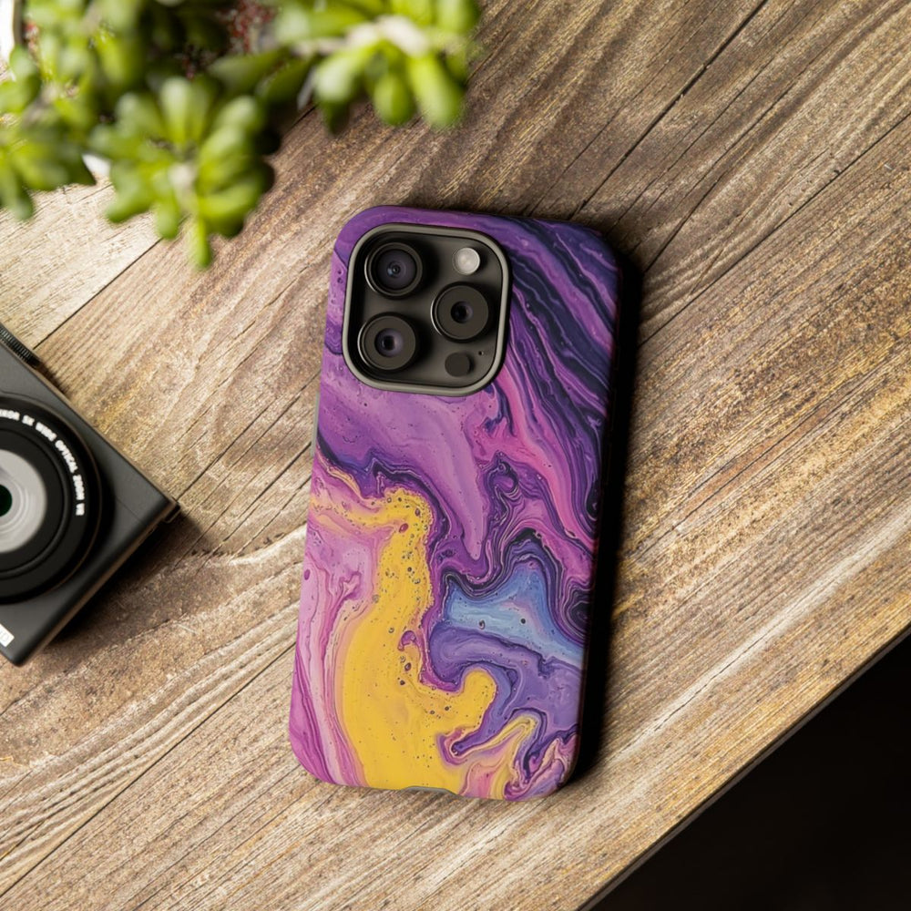 Dit ontwerp heeft een abstract patroon in vloeibare kunststijl, met golvende marmerkleuren waarin paars en geel de boventoon voeren. De acryl-giettechniek zorgt voor verfijnde, vloeiende vormen en texturen, met een mix van paarse, roze, gele en blauwe tinten. De afbeelding is haarscherp en gedetailleerd, waardoor dit matte, stevige telefoonhoesje met dubbele beschermlaag en ondersteuning voor draadloos opladen een opvallende keuze is.