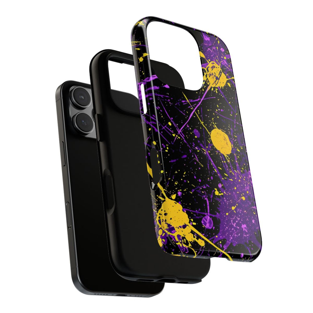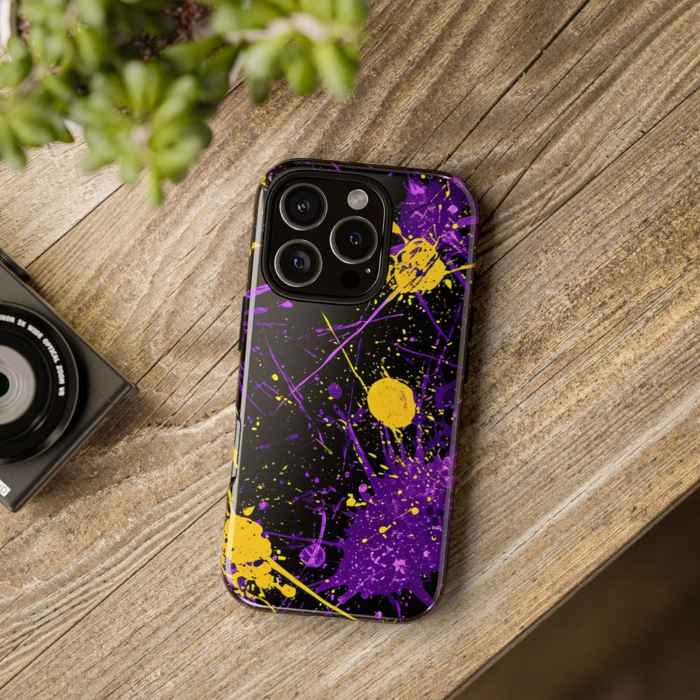 Dit telefoonhoesje heeft een abstract patroon van verfspatten in levendig paars en geel op een diepzwarte achtergrond. De spatten verschillen in grootte en vorm, wat zorgt voor een dynamisch en energiek effect. Het glanzende hoesje is extra stevig dankzij de dubbele laag met een polycarbonaat buitenkant en een TPU-binnenzijde voor optimale bescherming. Geschikt voor draadloos opladen en bestand tegen weersinvloeden, terwijl de helderheid behouden blijft.
