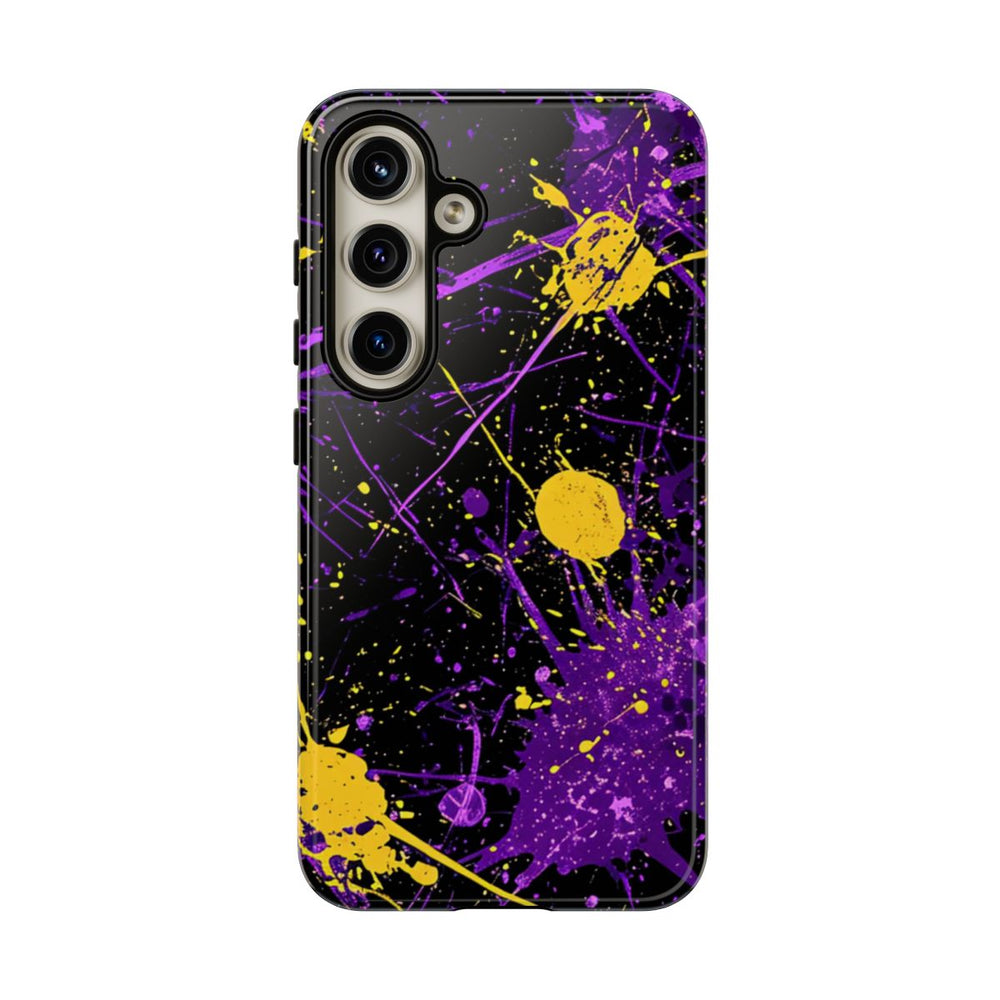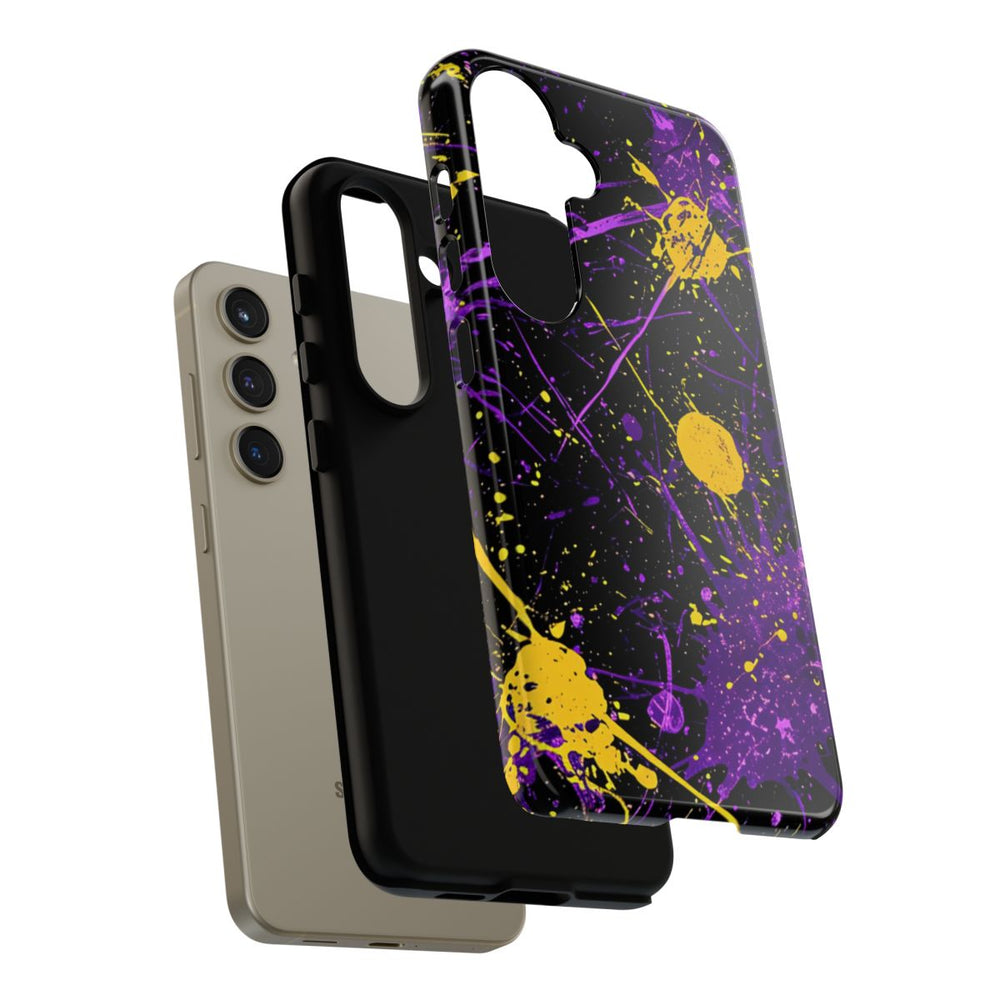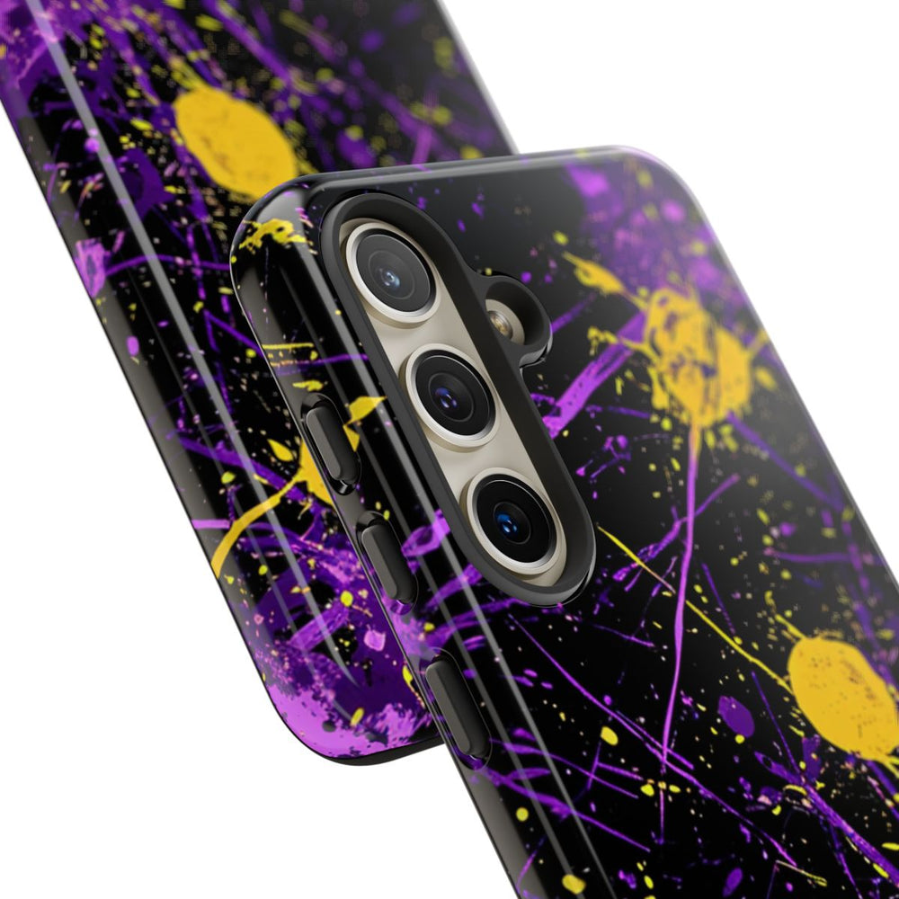 Dit telefoonhoesje heeft een abstract patroon van verfspatten in levendig paars en geel op een diepzwarte achtergrond. De spatten verschillen in grootte en vorm, wat zorgt voor een dynamisch en energiek effect. Het glanzende hoesje is extra stevig dankzij de dubbele laag met een polycarbonaat buitenkant en een TPU-binnenzijde voor optimale bescherming. Geschikt voor draadloos opladen en bestand tegen weersinvloeden, terwijl de helderheid behouden blijft.
