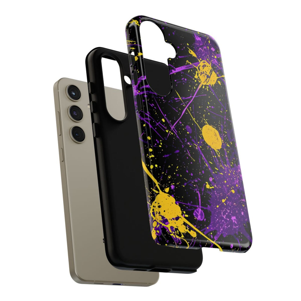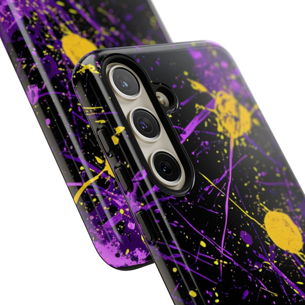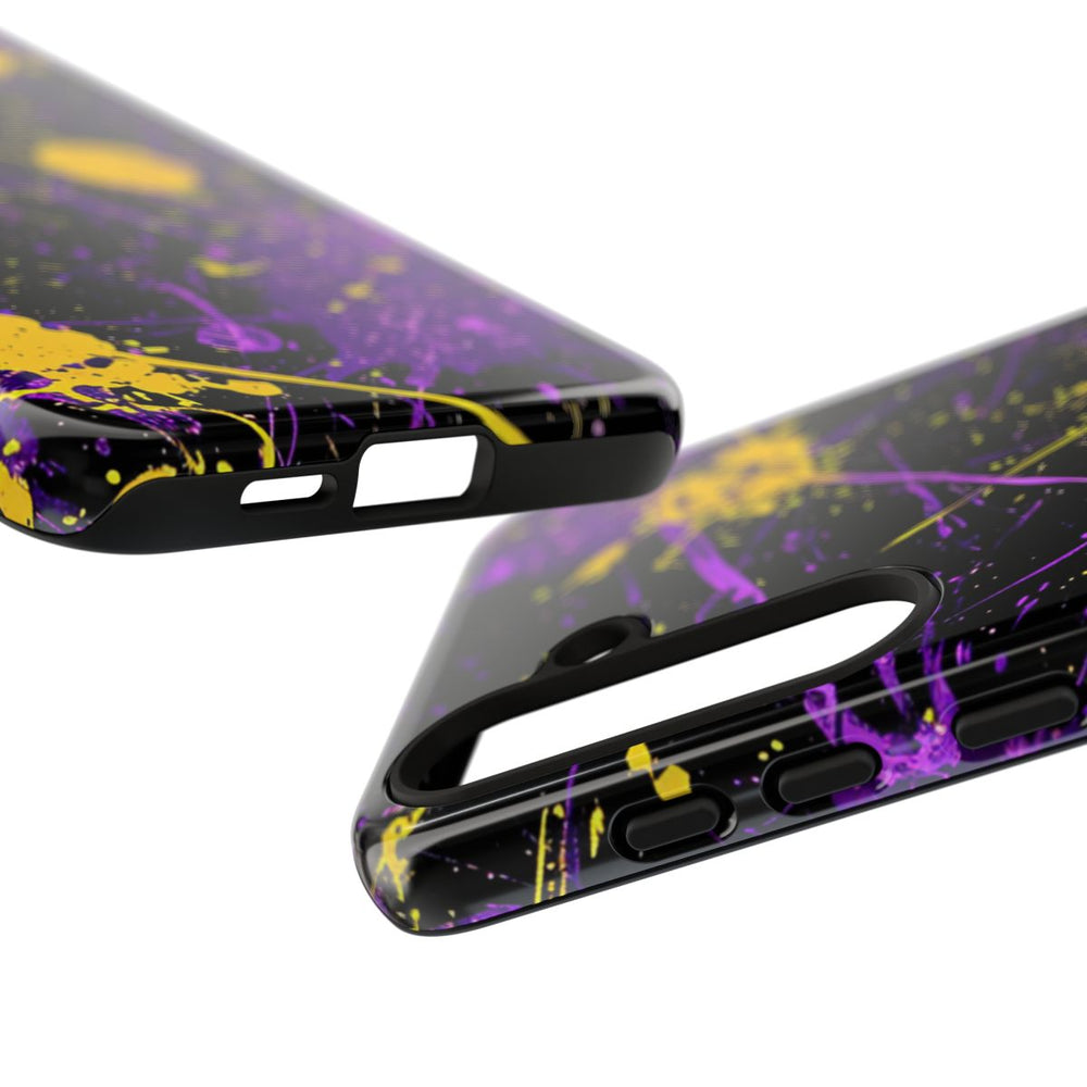 Dit telefoonhoesje heeft een abstract patroon van verfspatten in levendig paars en geel op een diepzwarte achtergrond. De spatten verschillen in grootte en vorm, wat zorgt voor een dynamisch en energiek effect. Het glanzende hoesje is extra stevig dankzij de dubbele laag met een polycarbonaat buitenkant en een TPU-binnenzijde voor optimale bescherming. Geschikt voor draadloos opladen en bestand tegen weersinvloeden, terwijl de helderheid behouden blijft.