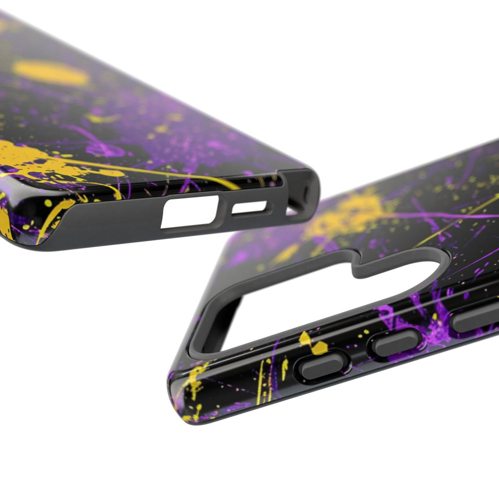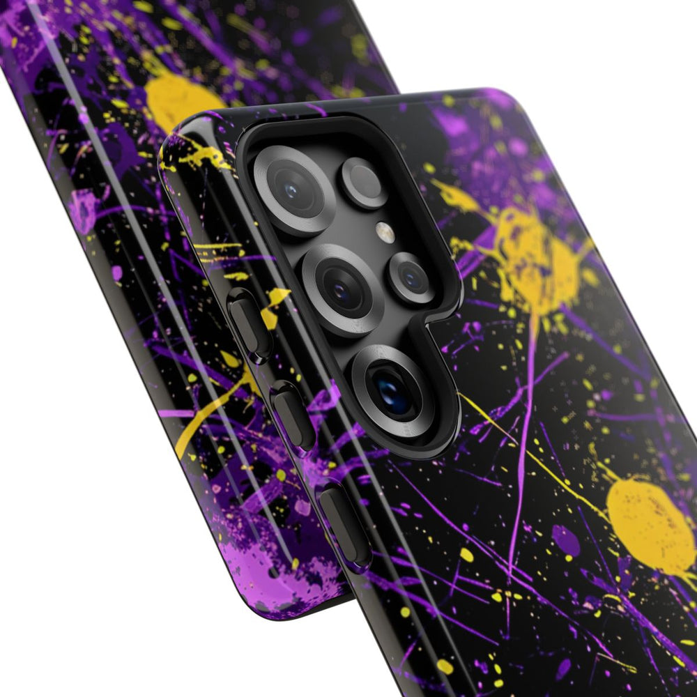 Dit telefoonhoesje heeft een abstract patroon van verfspatten in levendig paars en geel op een diepzwarte achtergrond. De spatten verschillen in grootte en vorm, wat zorgt voor een dynamisch en energiek effect. Het glanzende hoesje is extra stevig dankzij de dubbele laag met een polycarbonaat buitenkant en een TPU-binnenzijde voor optimale bescherming. Geschikt voor draadloos opladen en bestand tegen weersinvloeden, terwijl de helderheid behouden blijft.