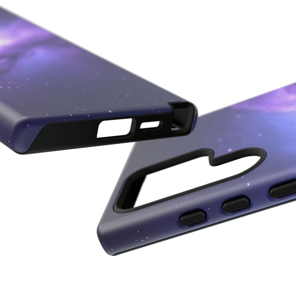 Dit hoesje is voorzien van een kosmische nevel in de ruimte, uitgevoerd in rijke paarse en violette tinten. De nevel heeft een lichtgevend middelpunt met zachte mist en waas die naar buiten uitlopen, omringd door een sterrenveld van kleine, heldere sterren op een diepe ruimte-achtergrond. Het hoesje bestaat uit twee lagen: een matte polycarbonaat buitenkant en een TPU binnenzijde. Het ondersteunt draadloos opladen en is bestand tegen invloeden van buitenaf.