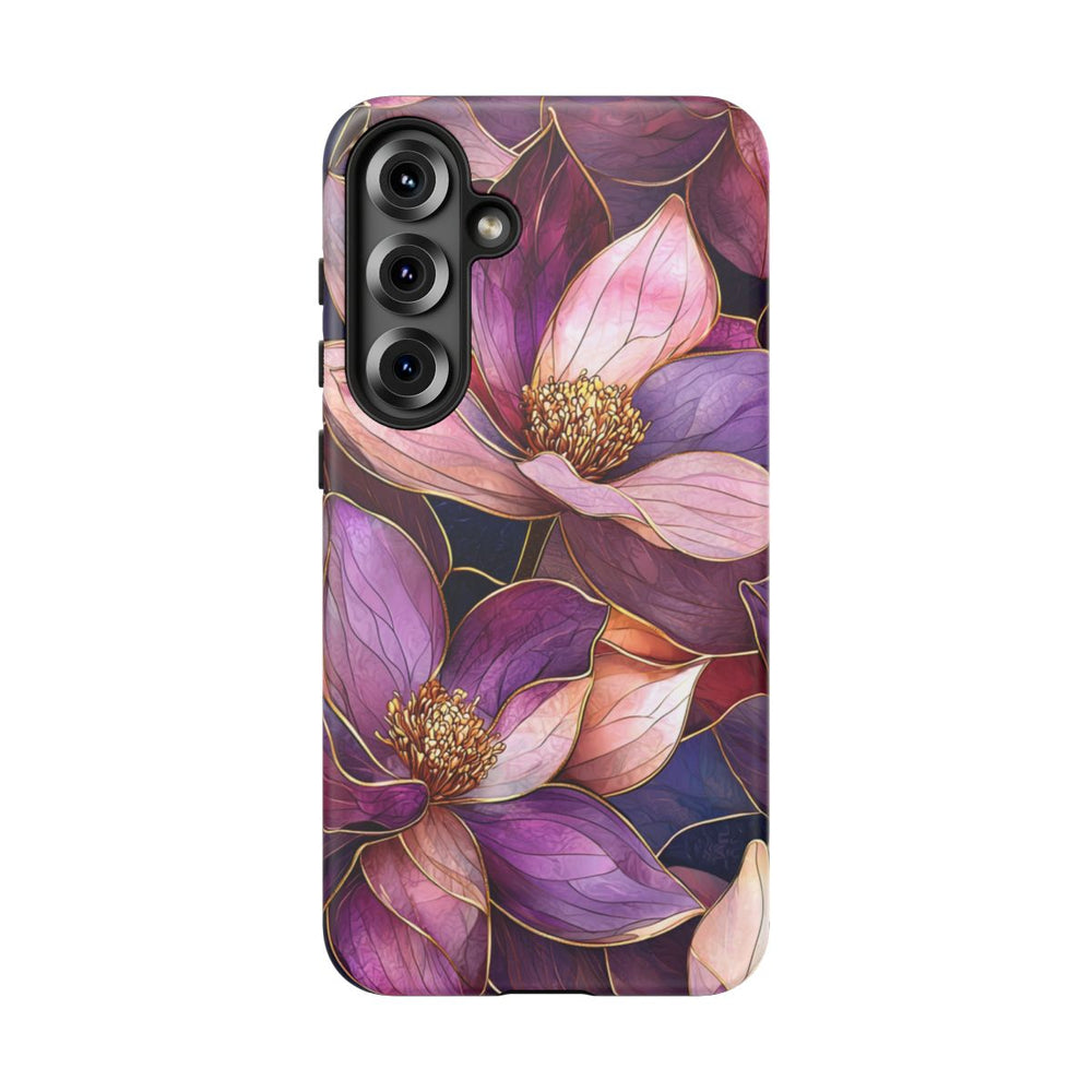 Dit ontwerp toont een close-up van magnoliabloemen met grote bloemblaadjes in paarse, roze en lila tinten. De bloemblaadjes hebben een glas-in-lood effect met fijne gouden lijnen, wat zorgt voor een stralende en doorschijnende uitstraling. De bloemen liggen dicht op elkaar en vormen zo een rijk en elegant bloemenpatroon. De donkere achtergrond versterkt het contrast en de diepte van de bloemblaadjes. Deze afbeelding is gedrukt op een mat telefoonhoesje met stevige dubbele laag en ondersteuning voor draadloos opladen.