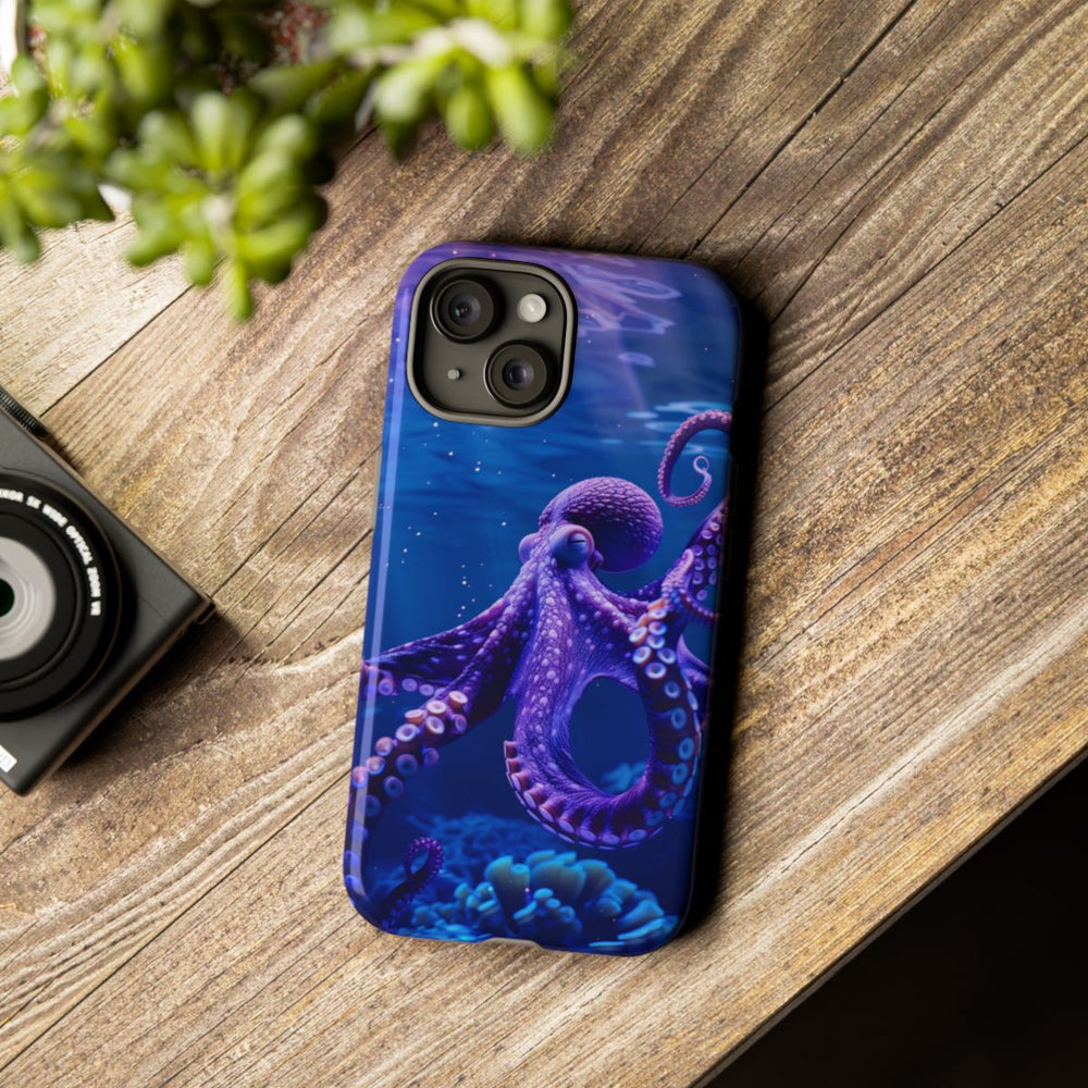 Dit hoesje is voorzien van een gedetailleerde afbeelding van een paarse octopus die sierlijk door het water zwemt. De tentakels krullen elegant in een diepblauwe oceaan, terwijl lichtstralen door het water vallen en zorgen voor een rustgevende, onderwater sfeer. De structuur en zuignappen van de armen zijn duidelijk zichtbaar. Het hoesje heeft een glanzende afwerking, bestaat uit een stevige polycarbonaat buitenkant met een TPU binnenzijde voor dubbele bescherming en ondersteunt draadloos opladen.