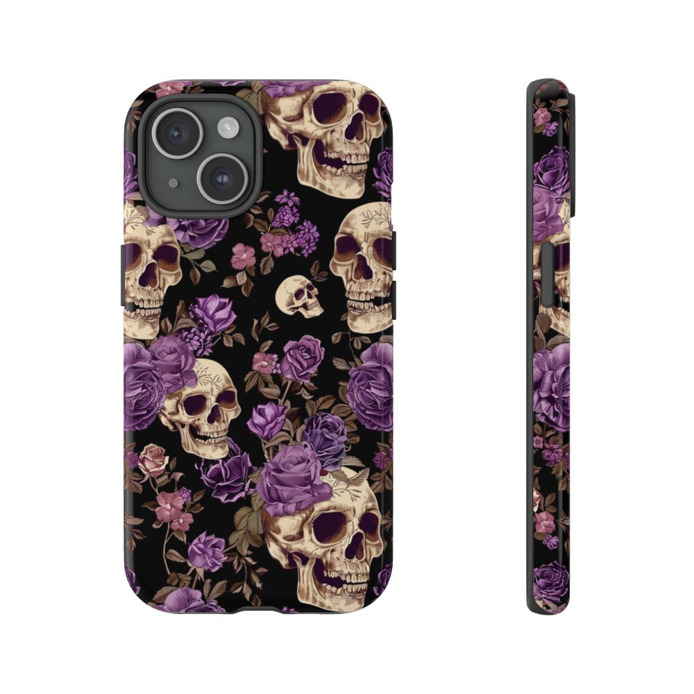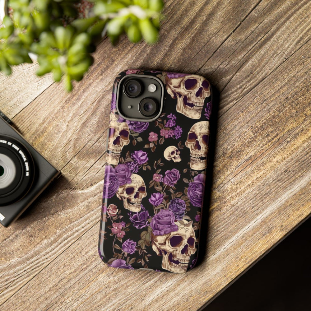 Dit hoesje heeft een opvallend patroon van gedetailleerde schedels, versierd met paarse rozen en diverse kleine bloemen op een effen zwarte achtergrond. De schedels zijn zorgvuldig geïllustreerd met natuurlijke schaduwen en de bloemen variëren in paarstinten, aangevuld met bladeren in gedempte bruintinten. Het patroon is dicht en gelijkmatig verdeeld, wat zorgt voor een krachtig contrast met de donkere achtergrond. Het hoesje is glanzend afgewerkt en bestaat uit twee lagen voor extra stevigheid en bescherming. Geschikt voor draadloos opladen.