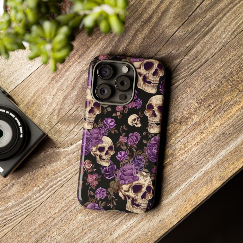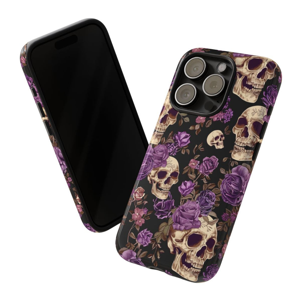 Dit hoesje heeft een opvallend patroon van gedetailleerde schedels, versierd met paarse rozen en diverse kleine bloemen op een effen zwarte achtergrond. De schedels zijn zorgvuldig geïllustreerd met natuurlijke schaduwen en de bloemen variëren in paarstinten, aangevuld met bladeren in gedempte bruintinten. Het patroon is dicht en gelijkmatig verdeeld, wat zorgt voor een krachtig contrast met de donkere achtergrond. Het hoesje is glanzend afgewerkt en bestaat uit twee lagen voor extra stevigheid en bescherming. Geschikt voor draadloos opladen.