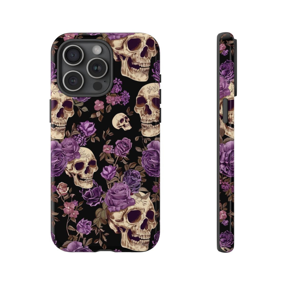 Dit hoesje heeft een opvallend patroon van gedetailleerde schedels, versierd met paarse rozen en diverse kleine bloemen op een effen zwarte achtergrond. De schedels zijn zorgvuldig geïllustreerd met natuurlijke schaduwen en de bloemen variëren in paarstinten, aangevuld met bladeren in gedempte bruintinten. Het patroon is dicht en gelijkmatig verdeeld, wat zorgt voor een krachtig contrast met de donkere achtergrond. Het hoesje is glanzend afgewerkt en bestaat uit twee lagen voor extra stevigheid en bescherming. Geschikt voor draadloos opladen.