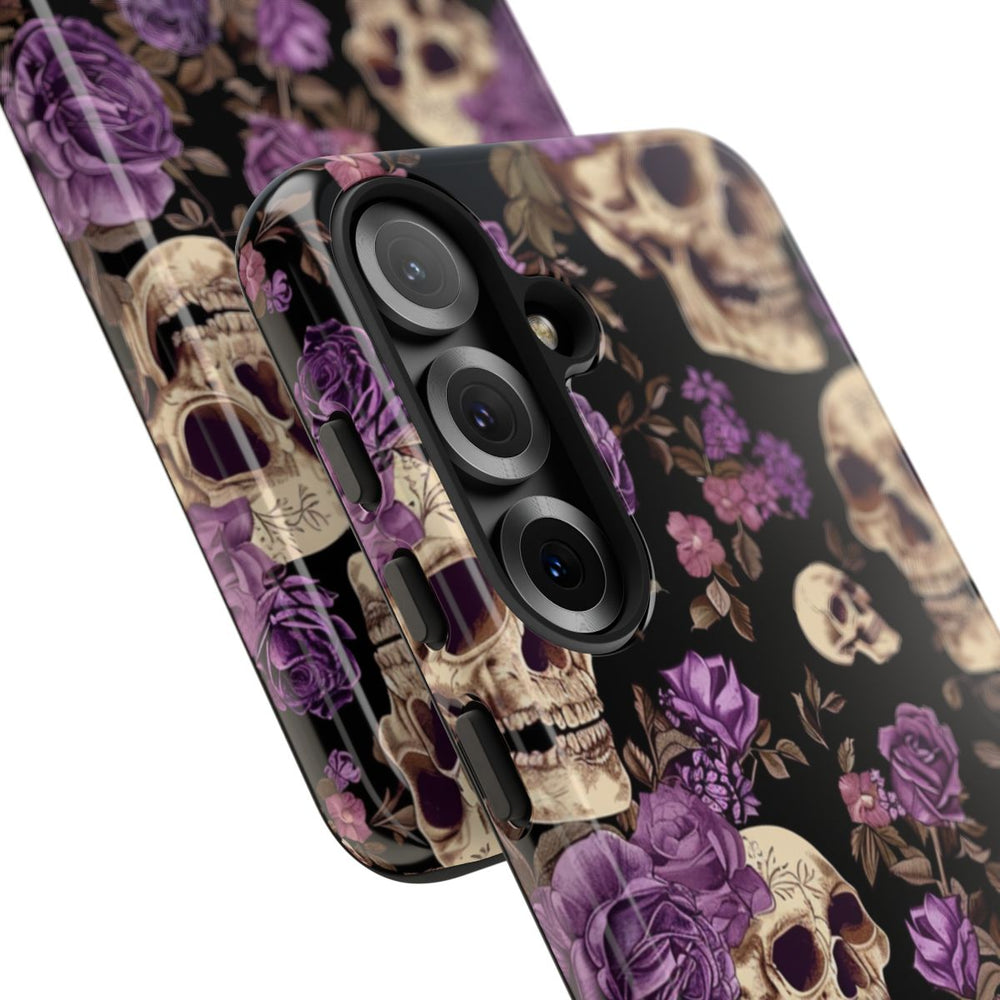 Dit hoesje heeft een opvallend patroon van gedetailleerde schedels, versierd met paarse rozen en diverse kleine bloemen op een effen zwarte achtergrond. De schedels zijn zorgvuldig geïllustreerd met natuurlijke schaduwen en de bloemen variëren in paarstinten, aangevuld met bladeren in gedempte bruintinten. Het patroon is dicht en gelijkmatig verdeeld, wat zorgt voor een krachtig contrast met de donkere achtergrond. Het hoesje is glanzend afgewerkt en bestaat uit twee lagen voor extra stevigheid en bescherming. Geschikt voor draadloos opladen.