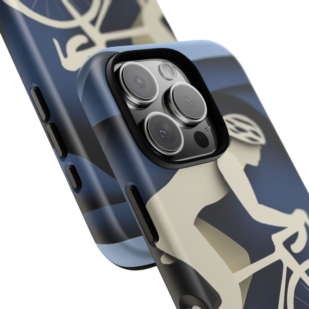 Dit hoesje is voorzien van een illustratie in papieren knipstijl van een fietser op een fiets. De fietser en fiets zijn uitgevoerd in een crèmekleur en steken mooi af tegen gelaagde blauwe heuvels en bomen, wat zorgt voor een gevoel van diepte. De achtergrond bestaat uit verschillende tinten blauw en creëert een rustige buitensfeer. Het hoesje heeft een dubbele laag met een matte afwerking, een stevige polycarbonaat buitenkant en een TPU-binnenzijde. Geschikt voor draadloos opladen, maar niet voor MagSafe.