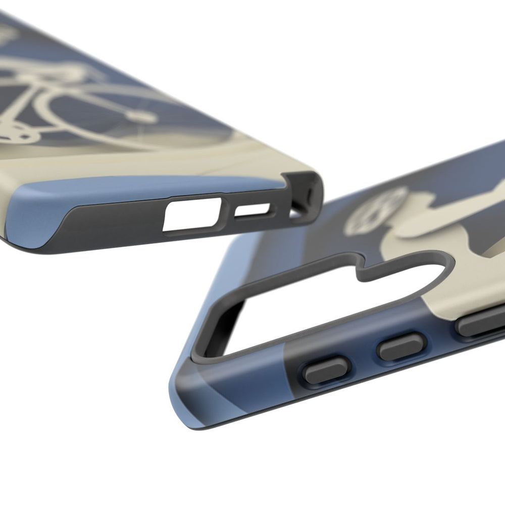 Dit ontwerp toont een fietser in papieren knipkunststijl die door een gelaagd blauw landschap rijdt. De achtergrond bevat gestileerde bomen en glooiende heuvels, allemaal vormgegeven met een papieren kunst effect in blauwtinten en crème. Het hoesje is een stevige, matte uitvoering met dubbele laag van polycarbonaat en TPU, biedt extra bescherming en is bestand tegen gebruik buitenshuis. Geschikt voor draadloos opladen.