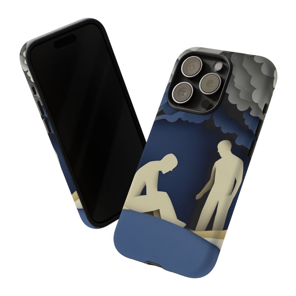 Dit hoesje heeft een illustratie in papieren knipkunststijl van twee mannen in een bos. Eén man zit op de grond met zijn hoofd omlaag, terwijl de ander naast hem staat en een hand op zijn schouder legt. De achtergrond bestaat uit gelaagde bomen en wolken in tinten blauw, beige en wit. Het hoesje is gemaakt van een polycarbonaat buitenkant en een TPU binnenzijde, wat zorgt voor dubbele bescherming en geschikt is voor draadloos opladen.