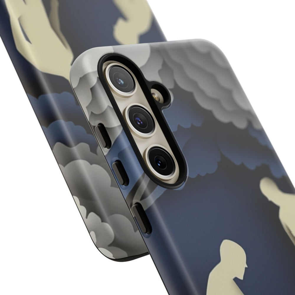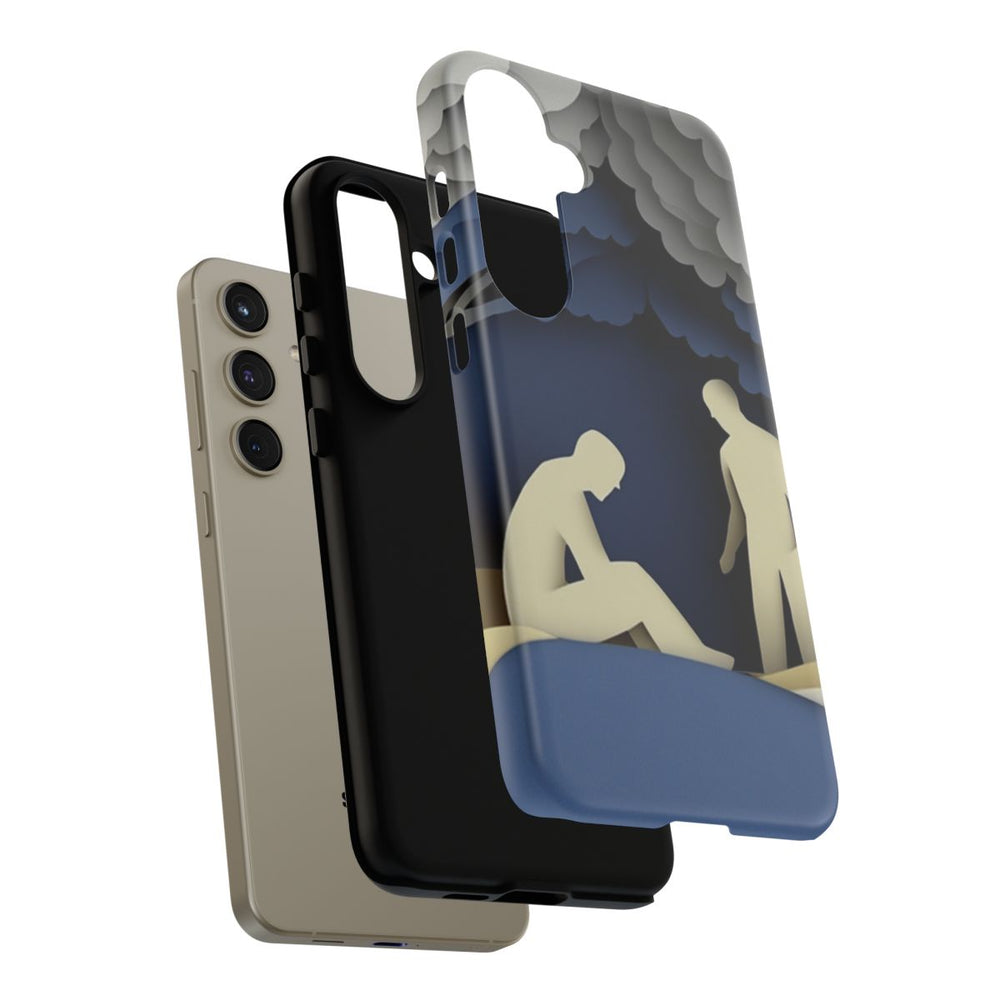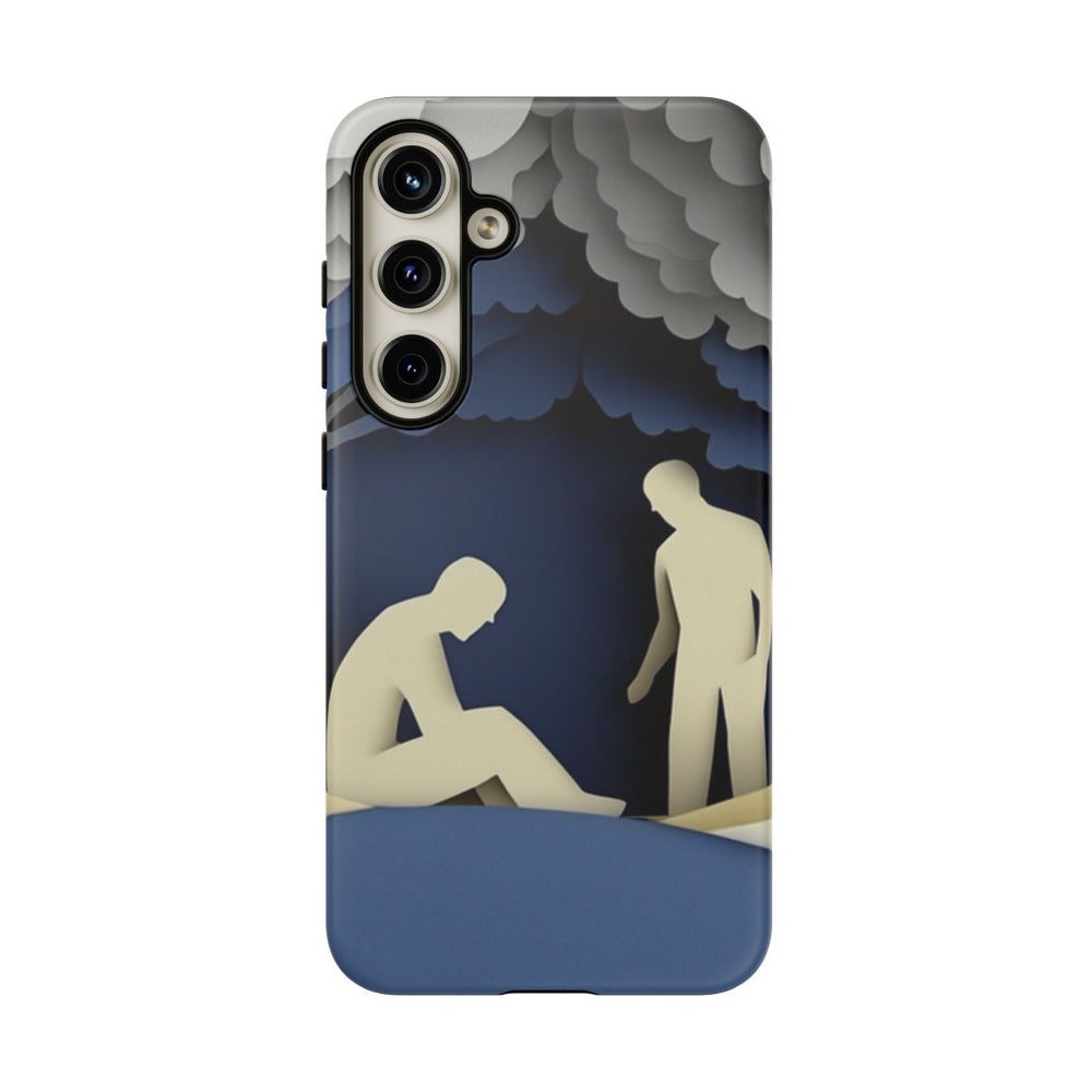 Dit hoesje toont een scène in papieren uitsnede-stijl met twee mannen in een bos. Eén man zit op de grond met zijn hoofd gebogen, terwijl de andere man naast hem staat met een hand op zijn schouder. Op de achtergrond zijn gelaagde bomen en wolken te zien in tinten wit, beige en blauw. Het hoesje bestaat uit twee lagen met een matte afwerking en is gemaakt van polycarbonaat en TPU. Ondersteunt draadloos opladen en biedt uitstekende bescherming.