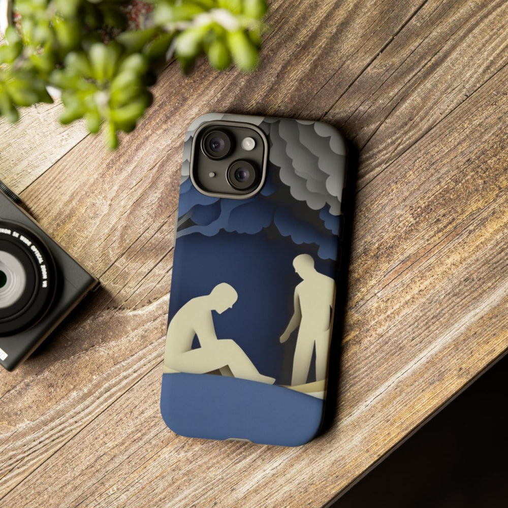Dit telefoonhoesje heeft een ontwerp in de stijl van gelaagde papieren uitsnedes, waarop twee mannen in een bosrijke omgeving te zien zijn. Eén man zit met gebogen hoofd, terwijl de ander naast hem staat en een hand op zijn schouder legt. Op de achtergrond zijn gestileerde bomen en glooiende heuvels te zien in tinten beige, grijs en blauw. Het hoesje bestaat uit twee lagen van polycarbonaat en TPU, heeft een matte afwerking en ondersteunt draadloos opladen. Niet geschikt voor MagSafe-accessoires.
