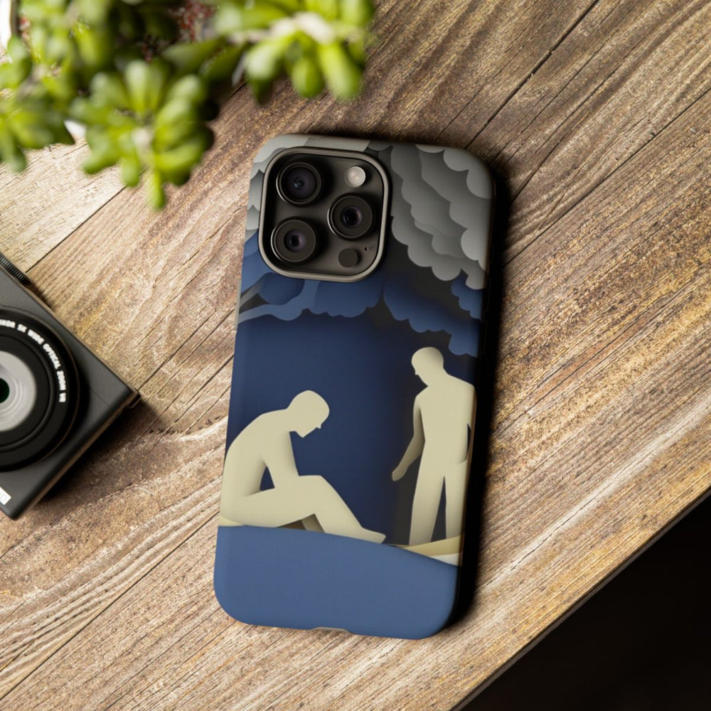 Dit hoesje toont een afbeelding in papieren uitsnede-stijl van twee mannen in een bosrijke omgeving. Eén man zit op de grond met zijn hoofd gebogen, terwijl de ander naast hem staat met een hand op zijn schouder. De scène bevat gestileerde bomen en gelaagd gebladerte in tinten crème, beige en blauw. De achtergrond is diepgroenblauw, wat zorgt voor een mooi contrast met de lichte elementen op de voorgrond. Het hoesje is gemaakt van polycarbonaat en TPU en biedt dubbele bescherming en ondersteuning voor draadloos opladen.