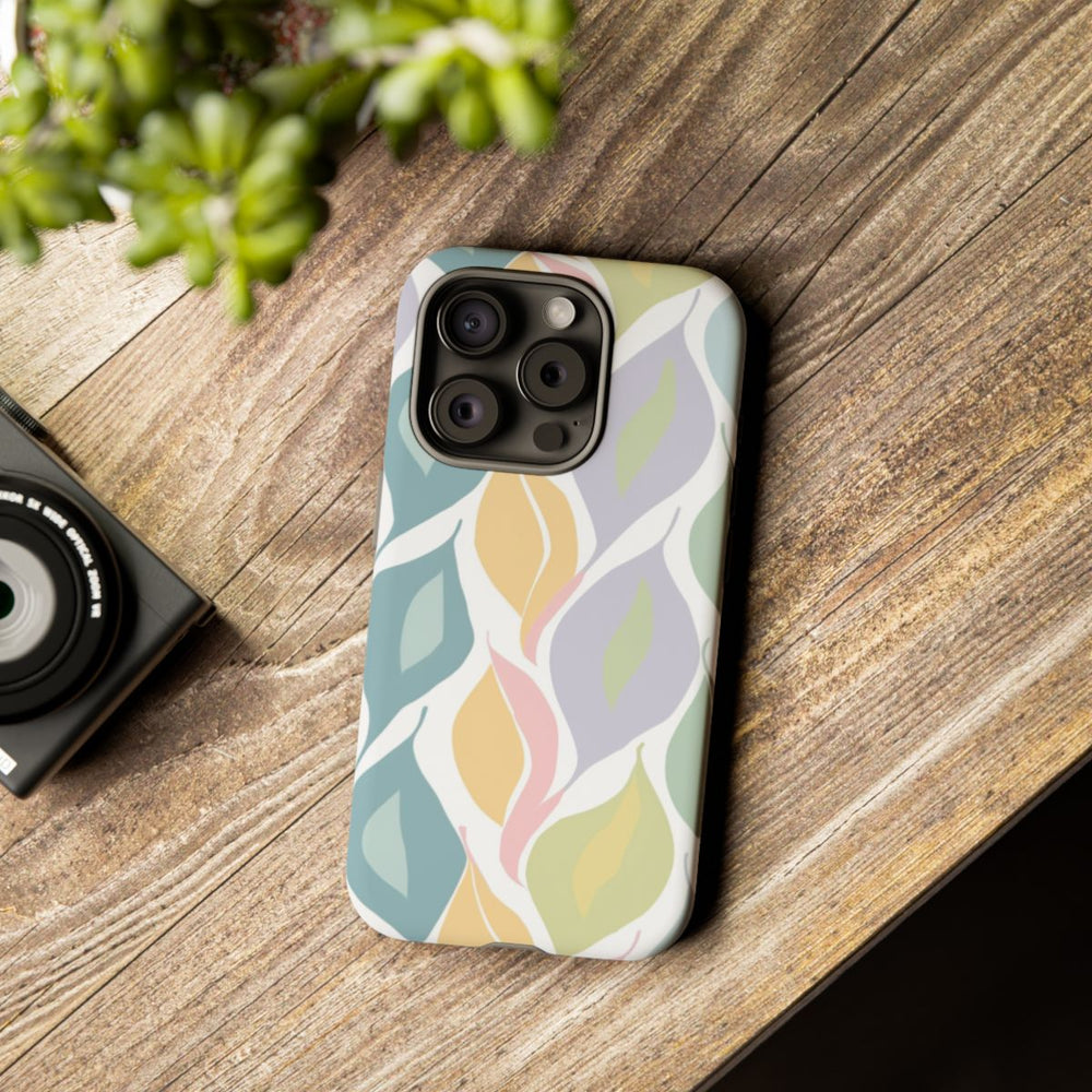 Dit telefoonhoesje is voorzien van een doorlopend patroon van gestileerde bladeren in zachte pastelkleuren zoals lichtblauw, lila, lichtgeel, mintgroen en perzik. De bladeren verschillen in vorm en grootte en zijn verticaal gerangschikt, wat zorgt voor een vloeiende, natuurlijke uitstraling. De witte achtergrond laat de subtiele tinten extra goed uitkomen. Het patroon is gedrukt op een mat hoesje met een stevige polycarbonaat buitenkant en een TPU binnenlaag, zodat je toestel optimaal beschermd is. Geschikt voor draadloos opladen.