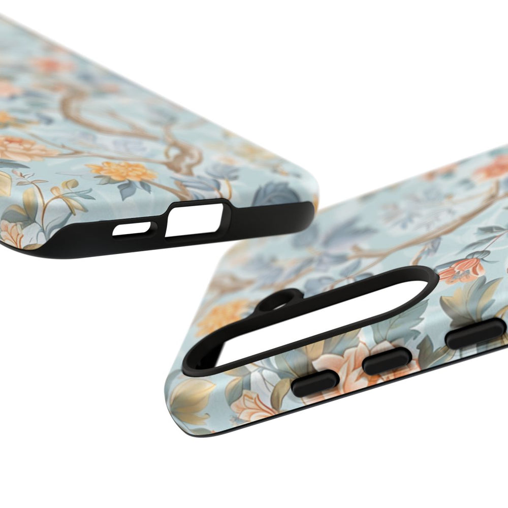 Dit hoesje is bedrukt met een verfijnd bloemenpatroon in chinoiserie-stijl, uitgevoerd in zachte pasteltinten. Het ontwerp toont bloeiende bloemen in perzik, crème en geel, omringd door bladeren in gedempte groene en blauwe kleuren. De bloemen en takken zijn gedetailleerd uitgewerkt en komen mooi uit tegen een lichtblauwe achtergrond. Het patroon is aangebracht op een matte, stevige hoes met dubbele laag van polycarbonaat en TPU. Dit zorgt voor een duurzame bescherming van je telefoon en ondersteunt draadloos opladen.