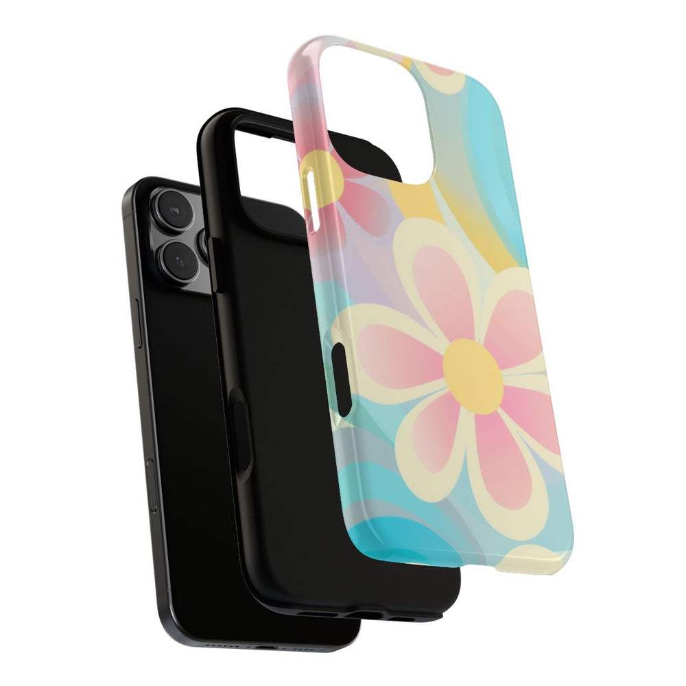 Dit hoesje heeft een opvallend bloemenpatroon met grote, gestileerde bloemen en sierlijke vormen. De zachte pasteltinten blauw, roze, geel en wit zorgen voor een frisse en vrolijke uitstraling. Het ontwerp ademt een retro sfeer uit de jaren 60 met vloeiende lijnen en een harmonieuze kleurencombinatie. Het hoesje is glanzend afgewerkt en bestaat uit twee lagen voor extra stevigheid en bescherming. Ondersteunt draadloos opladen en is bestand tegen weersinvloeden.